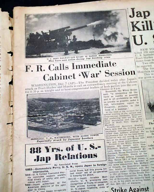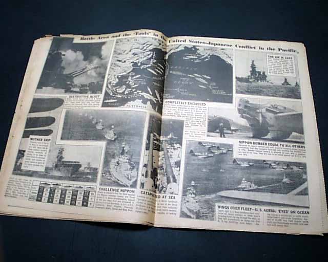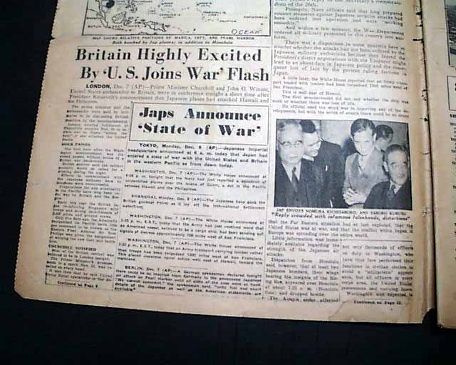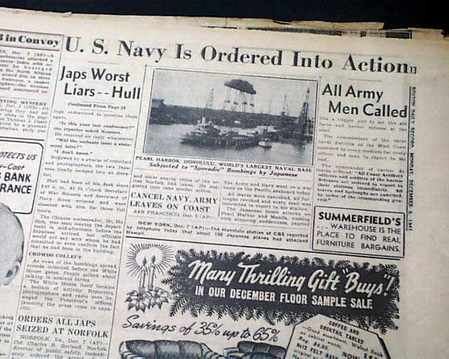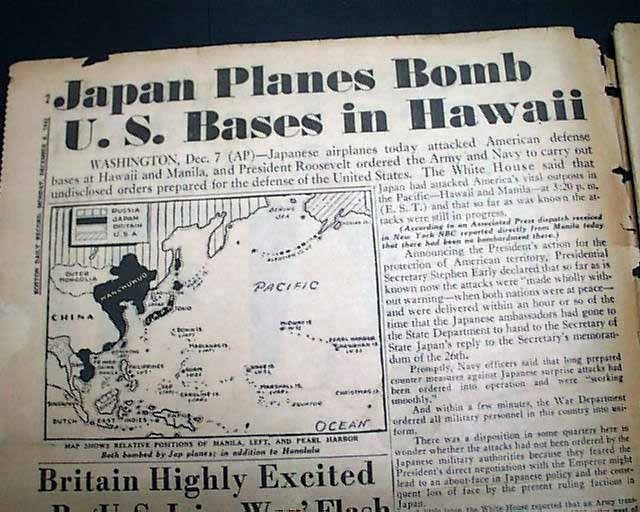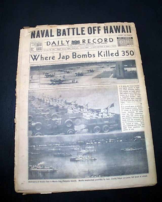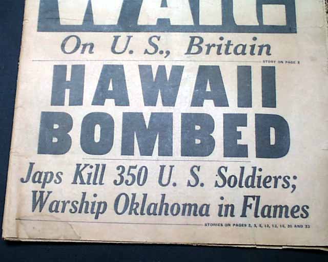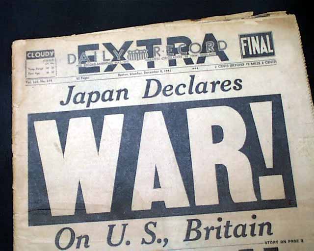 DAILY RECORD -- EXTRA, Boston, Dec. 8, `1941 A tabloid-size newspaper with the entire front page taken up with: "Japan Declares WAR! ON U.S., BRITAIN HAWAII BOMBED Japs Kill 350 U.S. Soldiers; Warship Oklahoma in Flames".