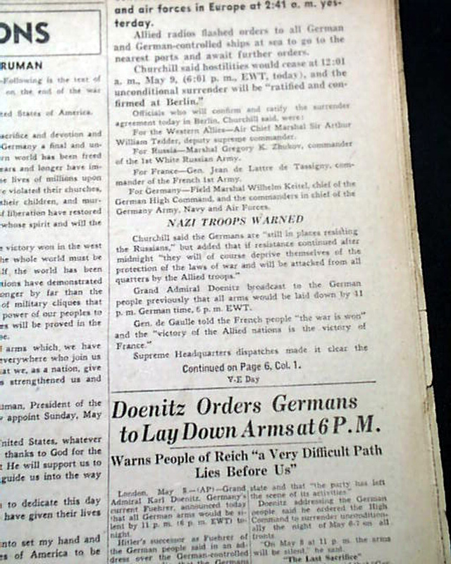 The banner headlines announce: "ALLIED ACCLAIM V-E DAY" "Terms To Be Signed In Berlin" "Guns Fall Silent At 6 Tonight" with many related subheads and a celebratory photo.