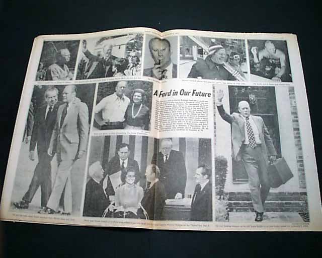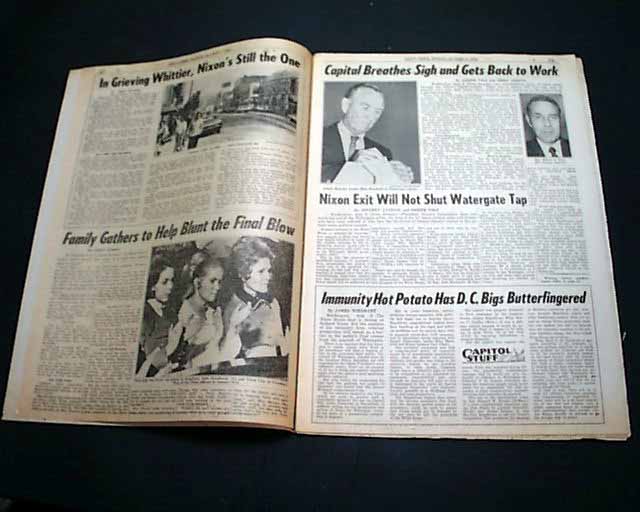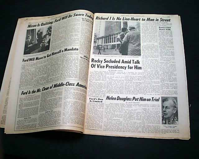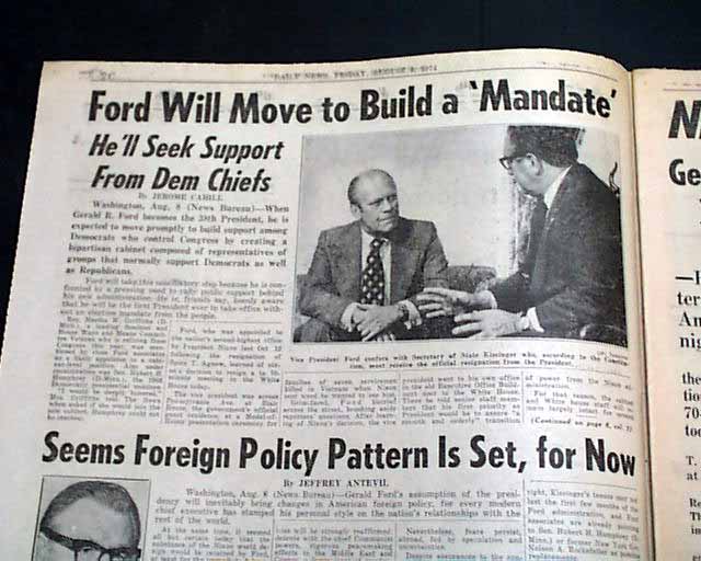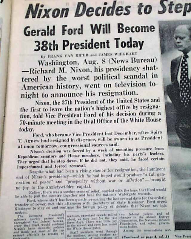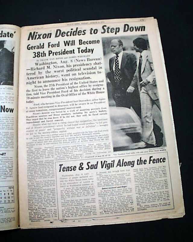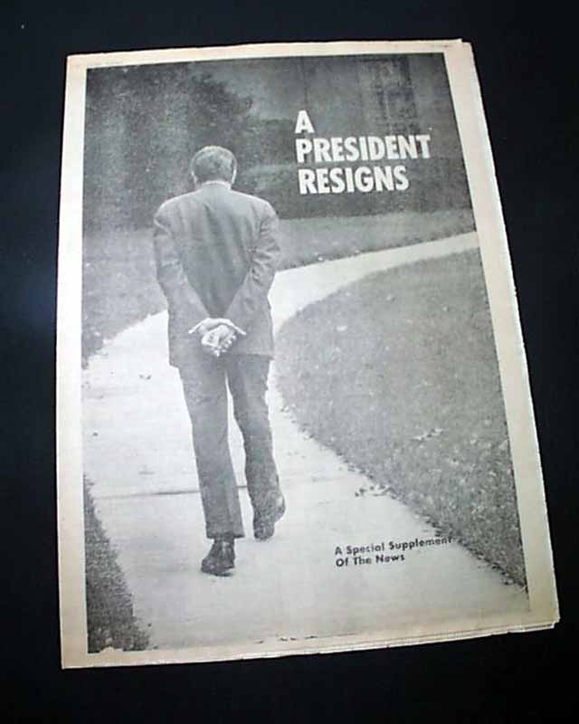 DAILY NEWS--EXTRA, New York Aug. 9, 1974 This issue is destined to become the defining newspaper on the Nixon era. A very dramatic front page with most of it taken up with: "NIXON QUITS". The balance has the official announcement: "President Nixon announced his resignation tonight in a TV address to the nation. Vice President Gerald R. Ford will become 38th President tomorrow."