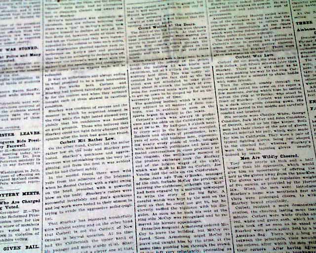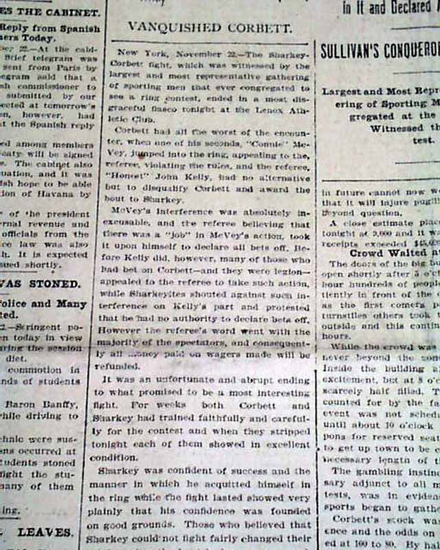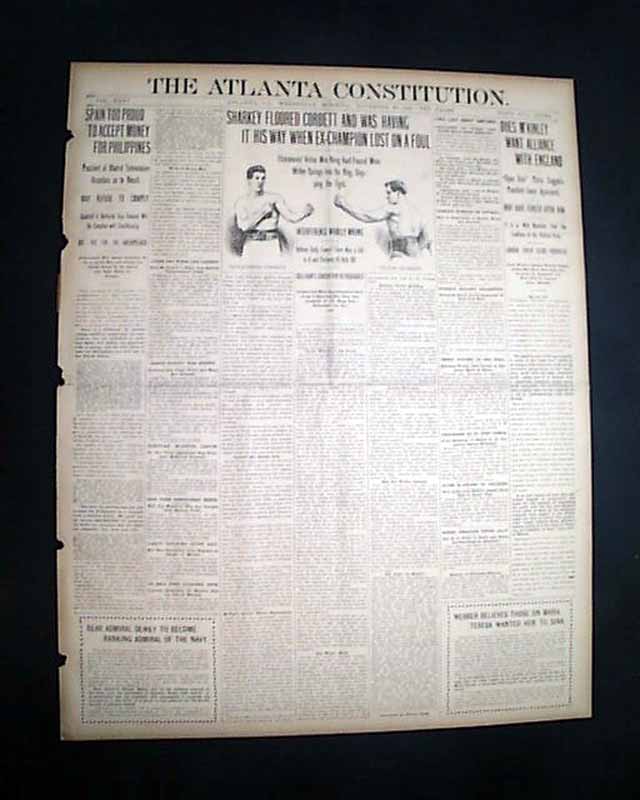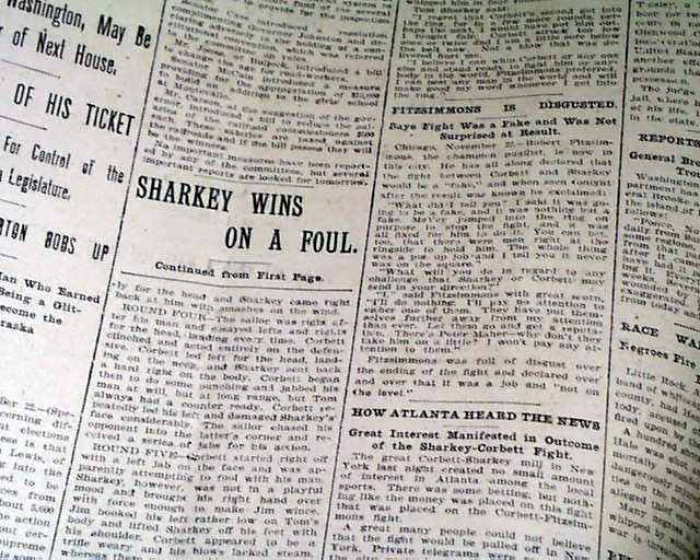 THE ATLANTA CONSTITUTION, Georgia, Nov. 23, 1898  The front page has a nice graphic on the historic boxing match between Sharkey and Corbett, with heads: "SHARKEY FLOORED CORBETT & WAS HAVING IT HIS WAY WHEN EX-CHAMPION LOST ON A FOUL" "Fitzsimmons' Victim Was Being Hard Pressed When McVey Springs Into the Ring, Stopping the Fight" "Interference Wholly Wrong" "Referee Kelly Feared There Was a Job in It and Declared All Bets Off" "Sullivan's Conqueror Retrogrades" and more.