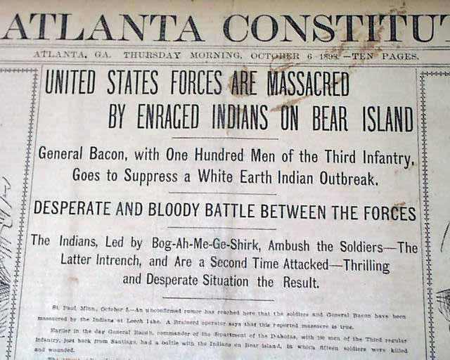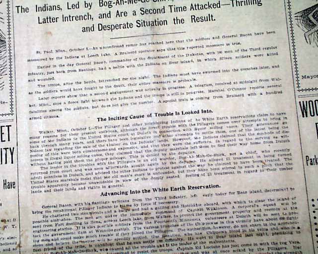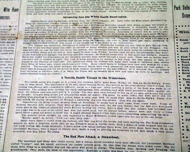 The front page is dominated by much reporting on the Battle of Sugar Point, with heads: "UNITED STATES FORCES ARE MASSACRED BY ENRAGED INDIANS ON BEAR ISLAND" "General Bacon, with 100 Men.l..Goes to Supress a White Earth Indian Outbreak" "Desperate & Bloody Battle Between the Forces" "The Indians...Ambush the Soldiers...Thrilling & Desperate Situation the Result".