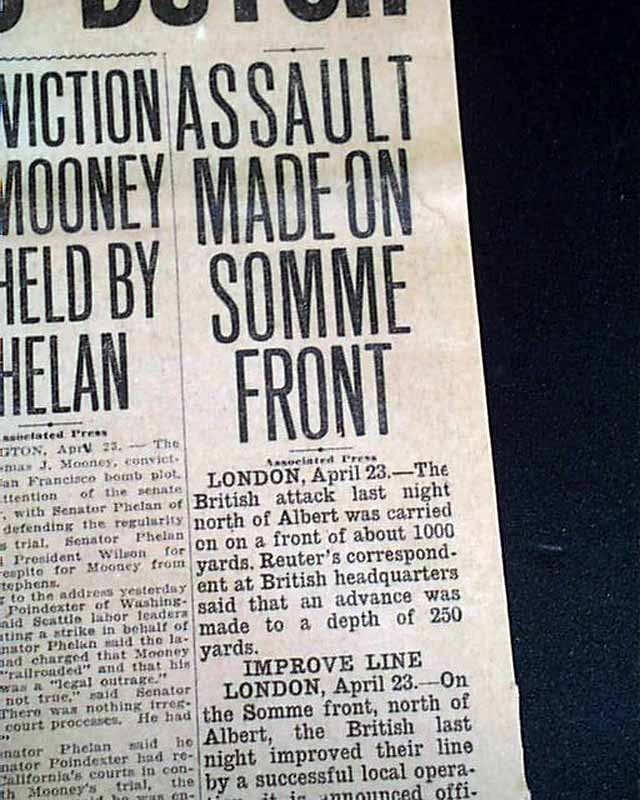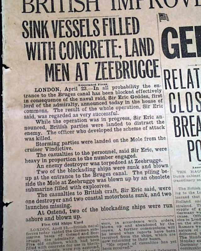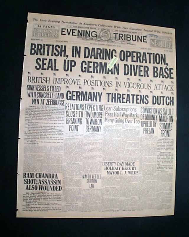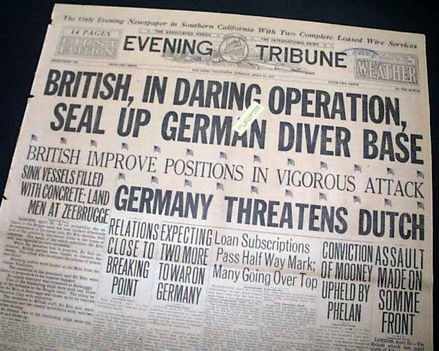 EVENING TRIBUNE, San Diego, California, April 23, 1918  Nice front page headlines on World War I include: "BRITISH, IN DARING OPERATOINS, SEAL UP GERMAN DIVER BASE" "British Improve Positions In Vigorous Attack" "Germany Threatens Dutch" and related subheads.