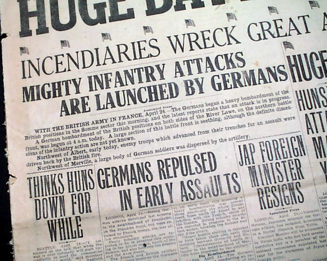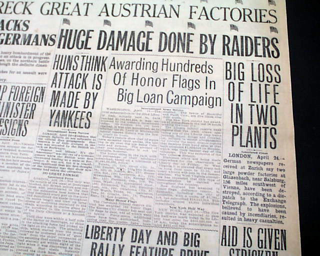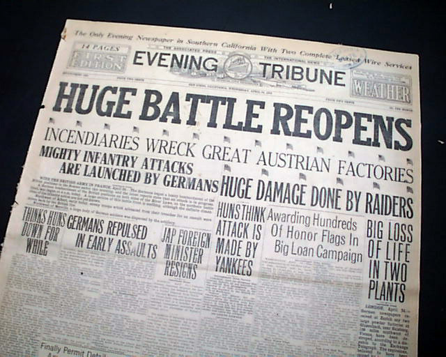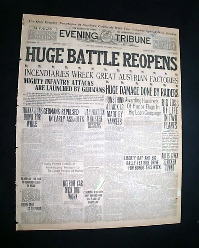 EVENING TRIBUNE, San Diego, California, April 24, 1918  Nice front page headlines on World War I include: "HUGE BATTLE REOPENS" "Incendiaries Wreck Great Austrian Factories" "Mighty Infantry Attacks Are Launched By Germans" "Huge Damage Done By Raiders" with related subheads on the war.