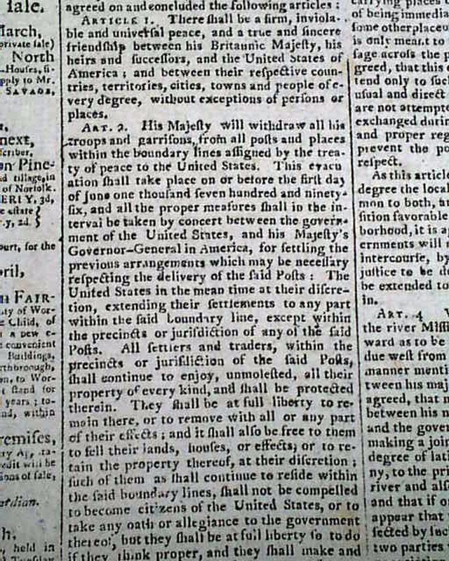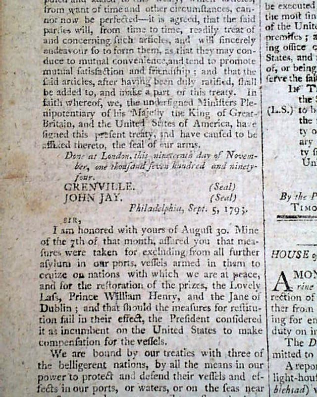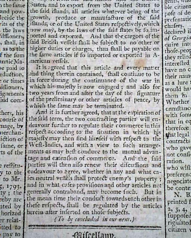 Text of the treaty concludes in the issue of the 19th taking all of the front page and a bit of page 2 where it is signed in type by Grenville and John Jay.