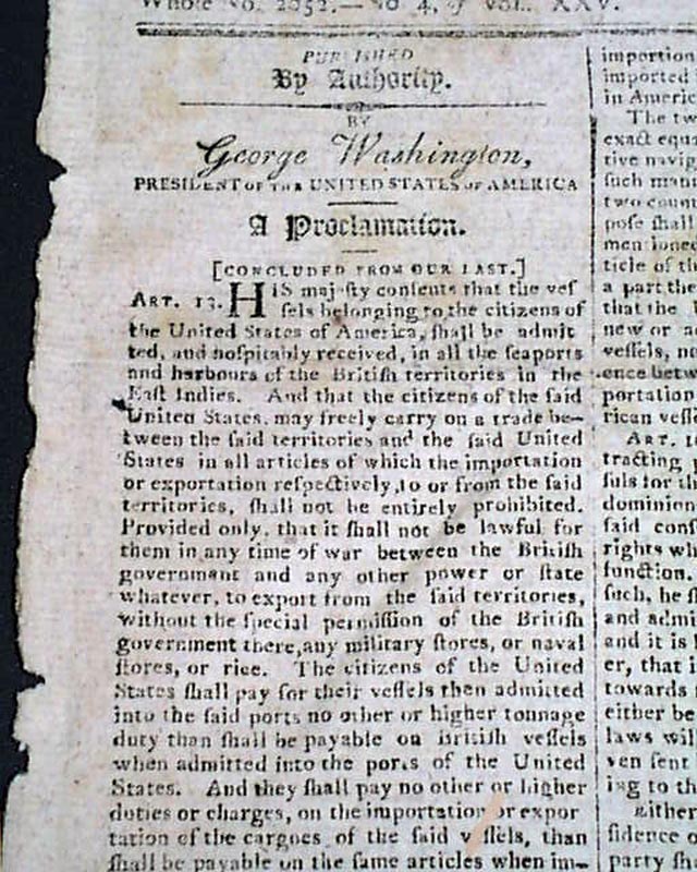 Taking much of the front page and part of page 2 in the issue of the 16th is part of Jay's Treaty through Article 12. Prefacing the Treaty is a "Proclamation" providing particulars about the conclusion and ratification of the Treaty. Includes word that the treaty was ratified upon the condition that much of the 12th article be suspended and be replaced with an additional article.