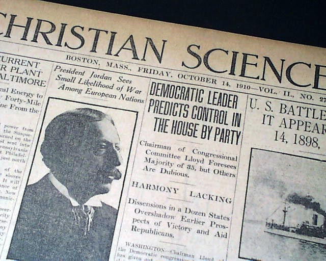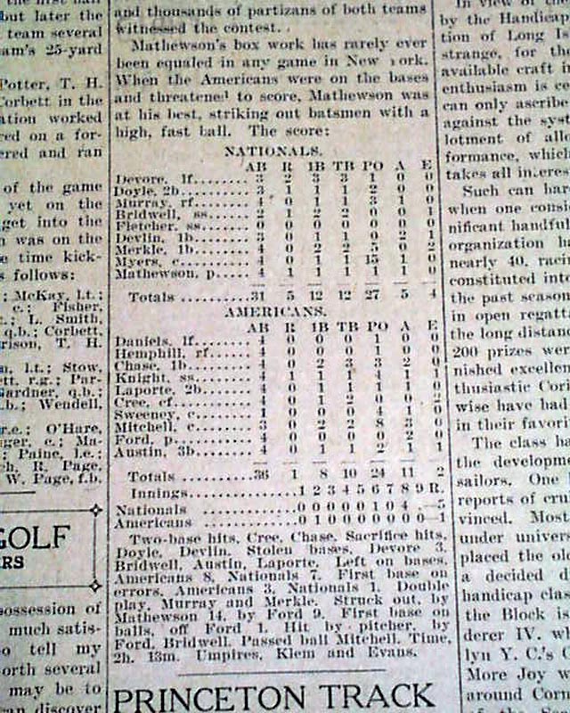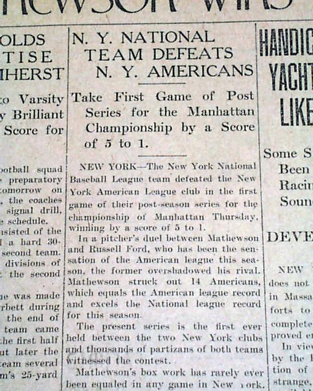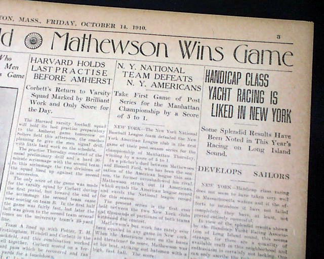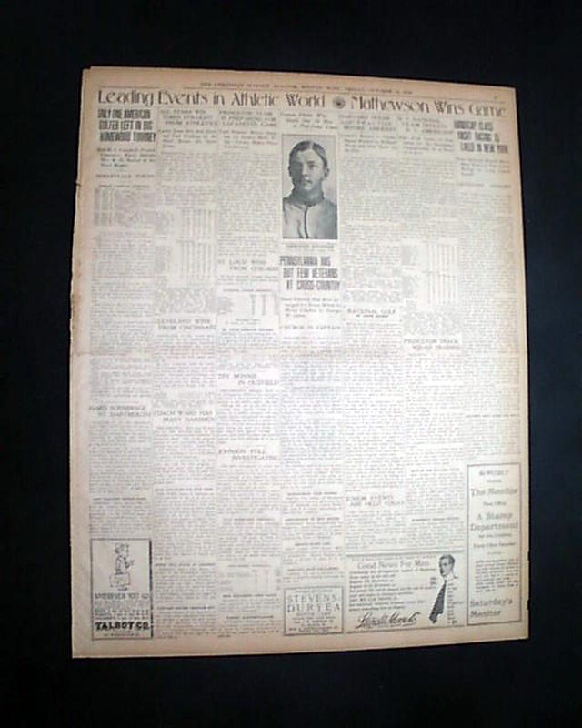 CHRISTIAN SCIENCE MONITOR, Boston, Oct. 14, 1910 Page 3 has a banner headline: "Leading Events in Athletic World - Mathewson Wins Game" with an uncommon photo of him headed: "Famous Pitcher Who Struck Out 14 Men in Post-Series Game" and captioned: "Christopher Mathewson, New York National league club."