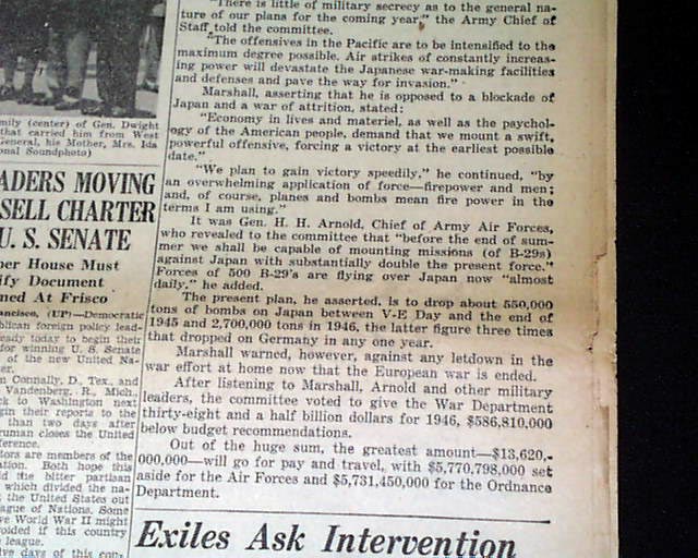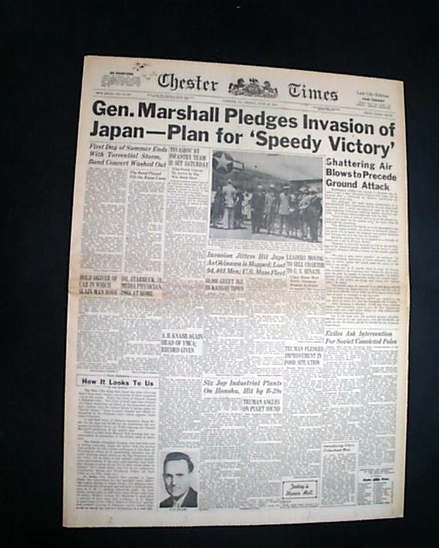 CHESTER TIMES, Pennsylvania, June 22, 1945 The banner headline notes: "Gen. Marshall Pledges Invasion of Japan---Plan for 'Speedy Victory' " with many related subheads.