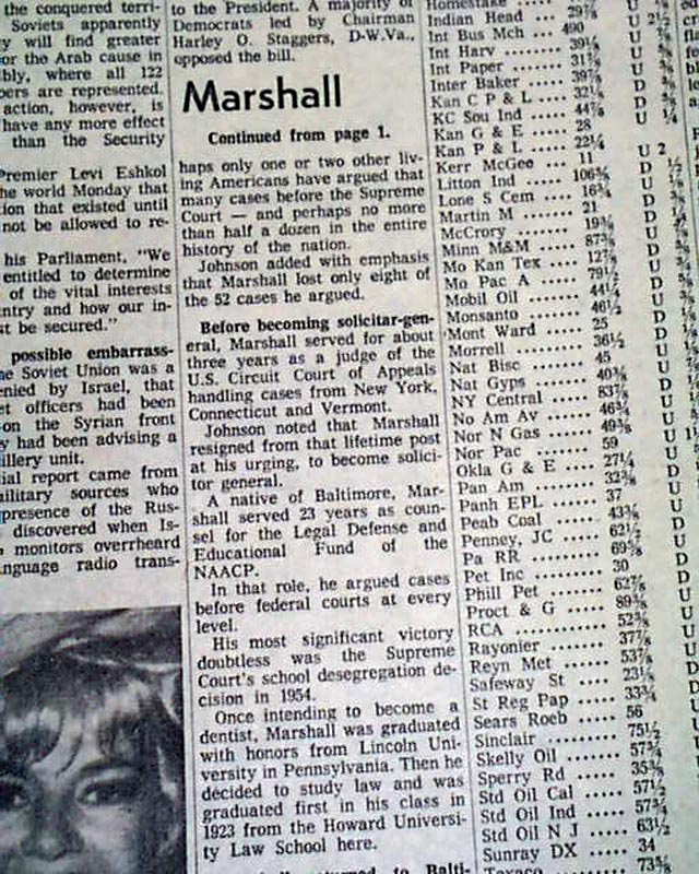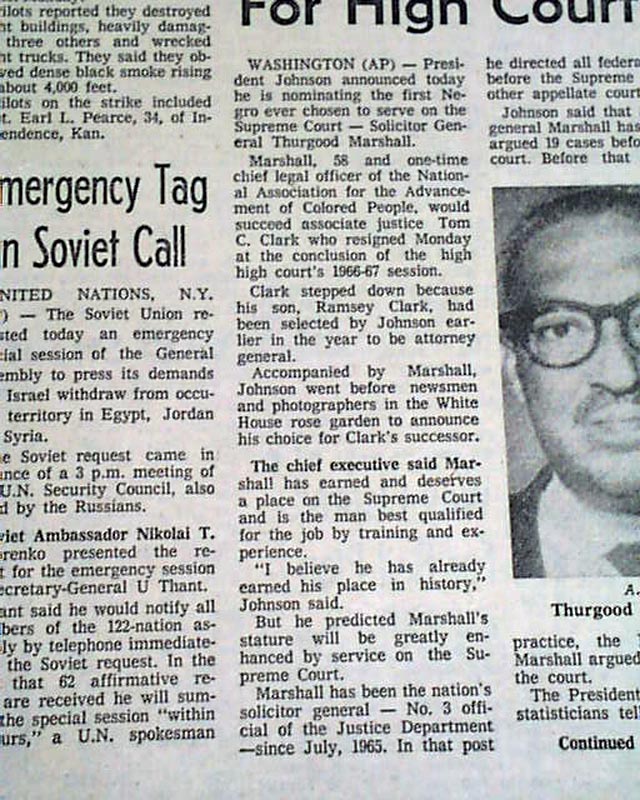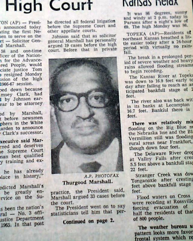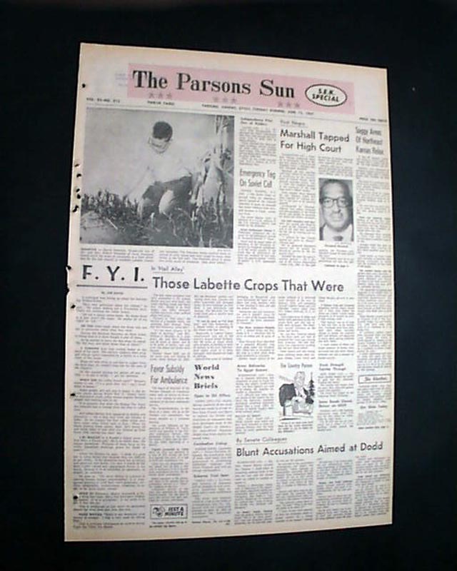 THE PARSONS SUN, Kansas, June 13, 1967  The front page has a reportr headed: "First Negro... Marshall Tapped For High Court" which includes a photo of him captined: "Thurgood Marshall." The report carries over to page 2.