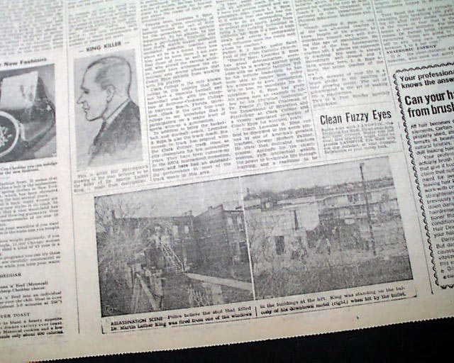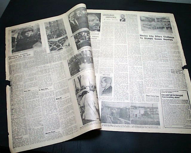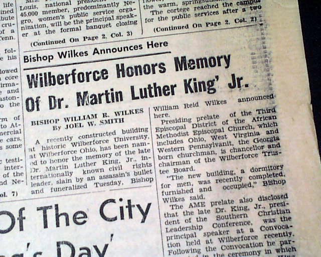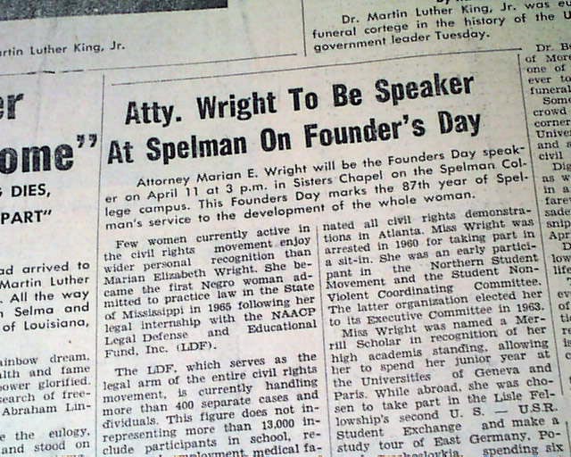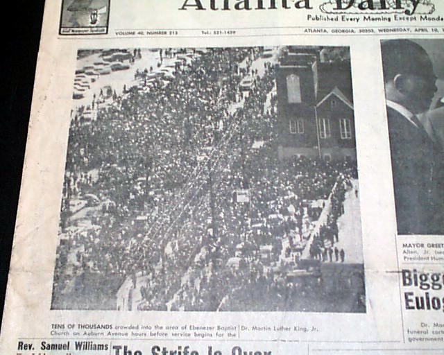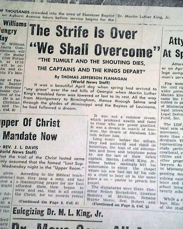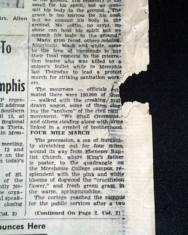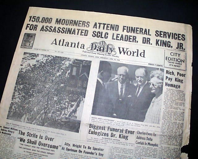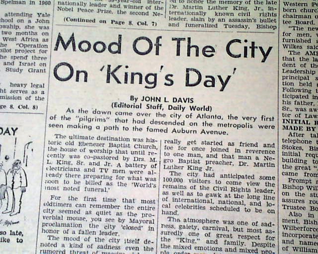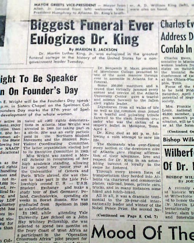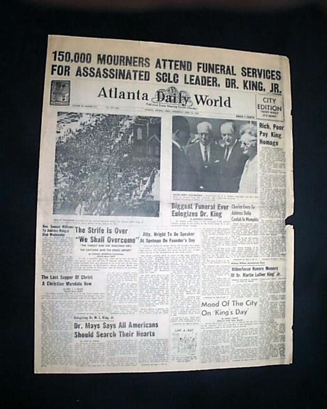 Great to have this banner headline above the masthead: "150,000 MOURNERS ATTEND FUNERAL SERVICES FOR ASSASSINATED SCLC LEADER, DR. KING, JR." with related subheads and two photos.