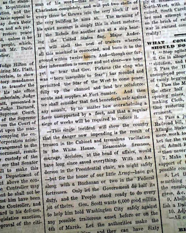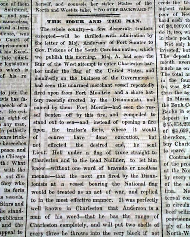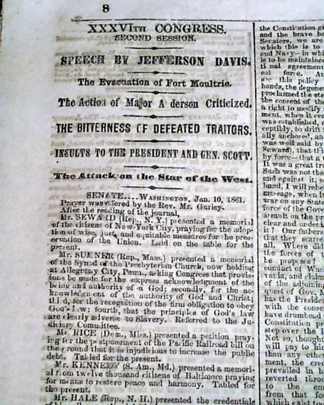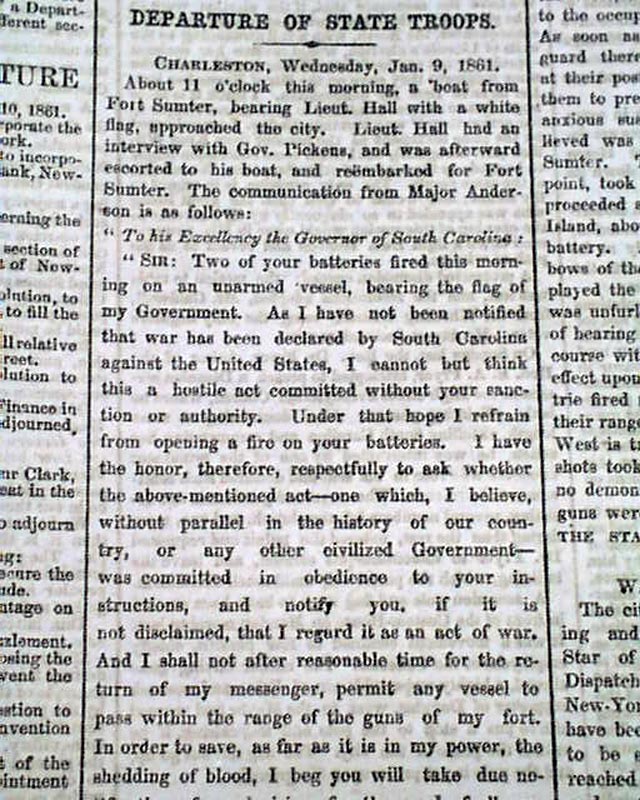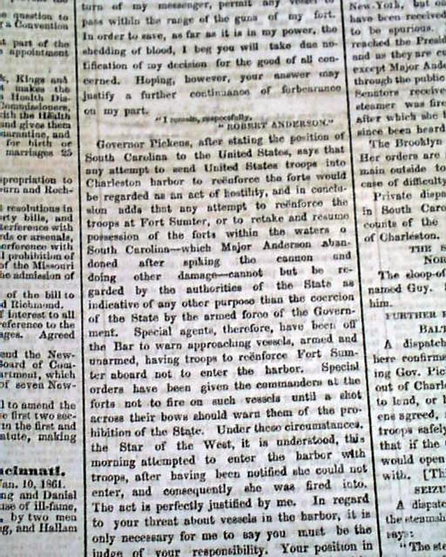 Some column heads include: "Highly Important From Charleston" "The Firing Into the Star of the West" "She is Driven Out of the Harbor" "Patriotic Letter From Maj. Anderson" "War Upon the United States" "Seizure of Forts In Louisiana" "Departure of State Troops" "What Congress Might & Should Do to Save the Union" "The Hour & the Man" "The Proof-Slavery Rebellion - Secession Is War" "Speech of Jefferson Davis" "The Evacuation of Fort Moultrie" "The Bitterness of Defeated Traitors" and even more.