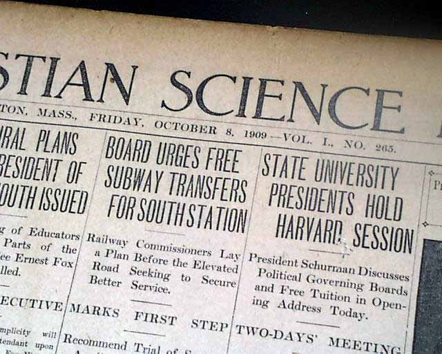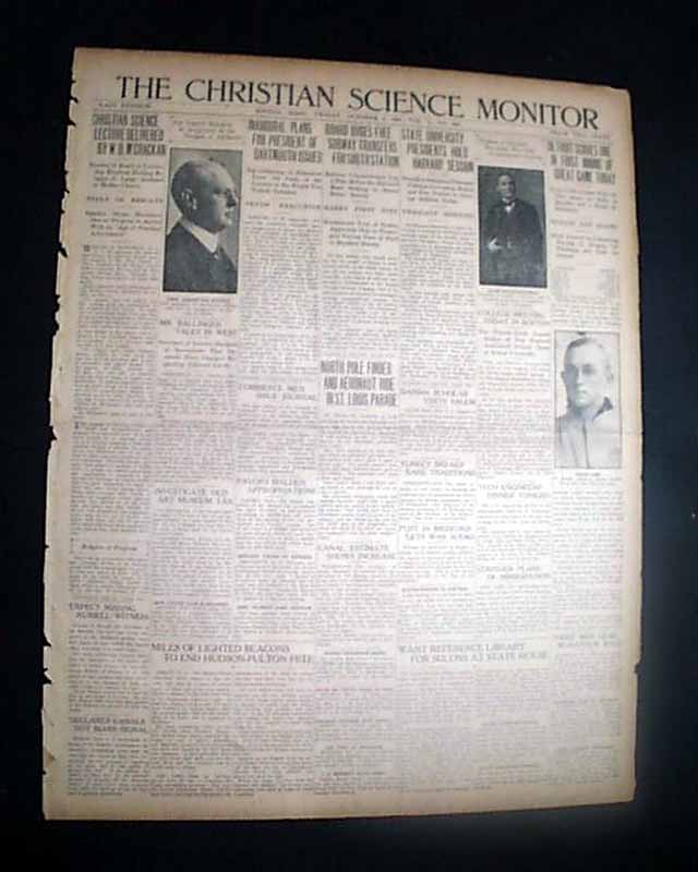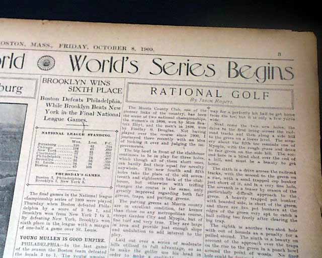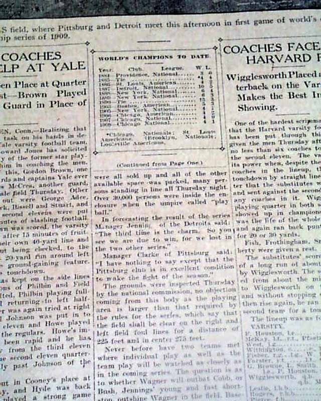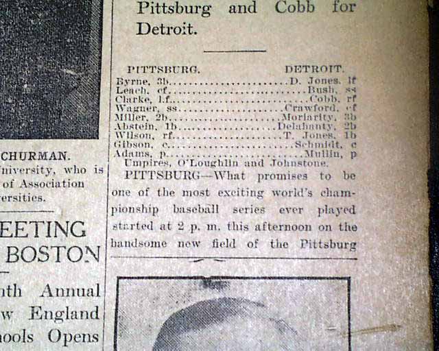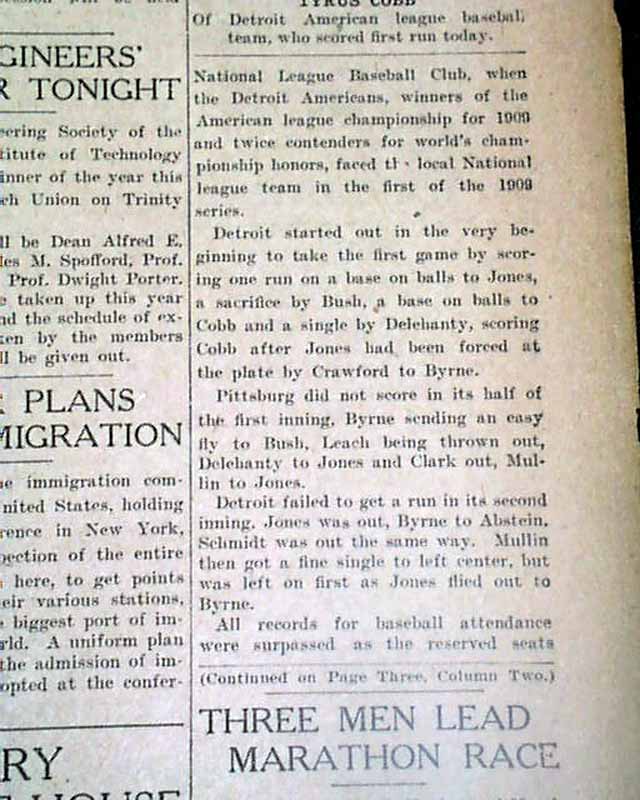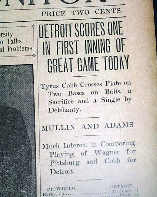 THE CHRISTIAN SCIENCE MONITOR, Boston, Oct. 8, 1909  The front page has a column headed: "Detroit Scores One In First Inning Of Great Game Today" "Tyrus Cobb Crosses Plate on Two Bases on Balls, a Sacrifice and a Single by Delehanty" "Mullin & Adams" "Much Interesting in Comparing Playing of Wagner for Pittsburg and Cobb for Detroit".