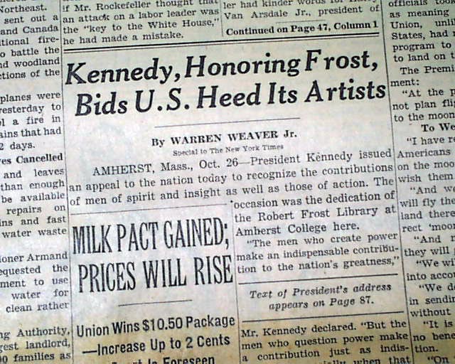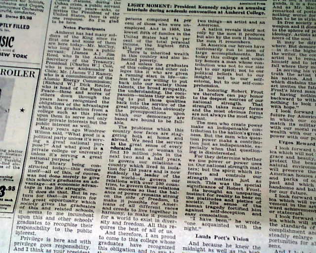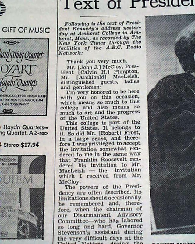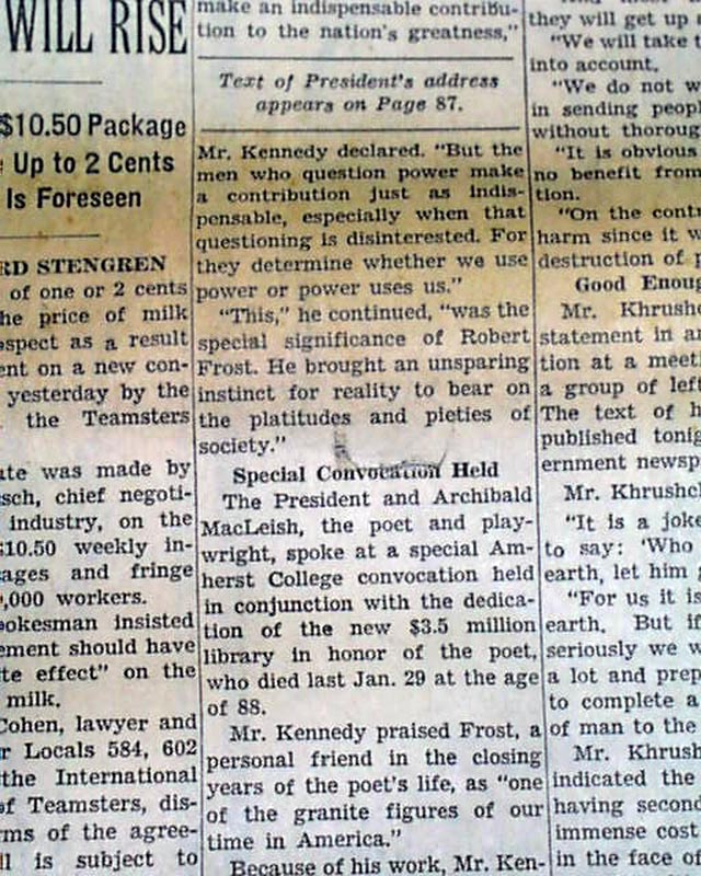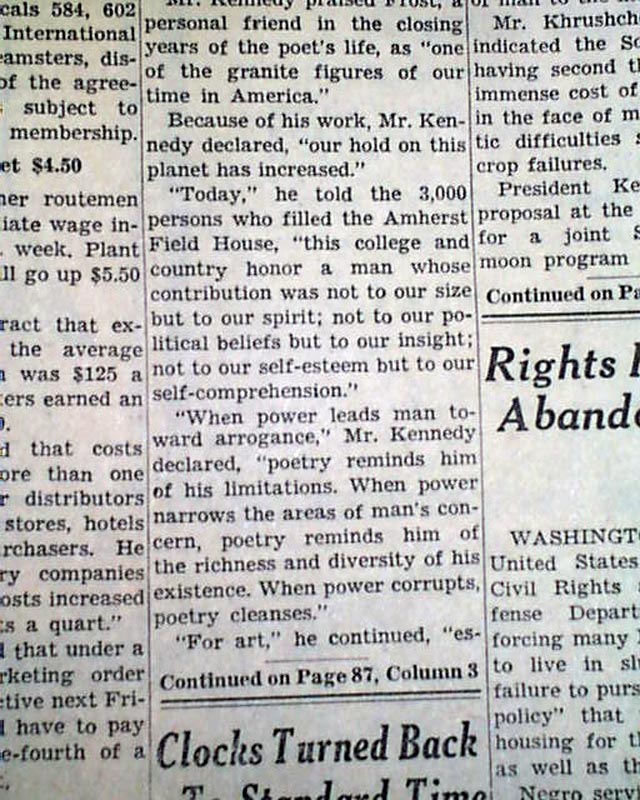 The front page has an article: "Kennedy, Honoring Frost, Bids U.S. Heed Its Artists" which carries over to page 87, where is found what would prove to be the last public address by JFK.