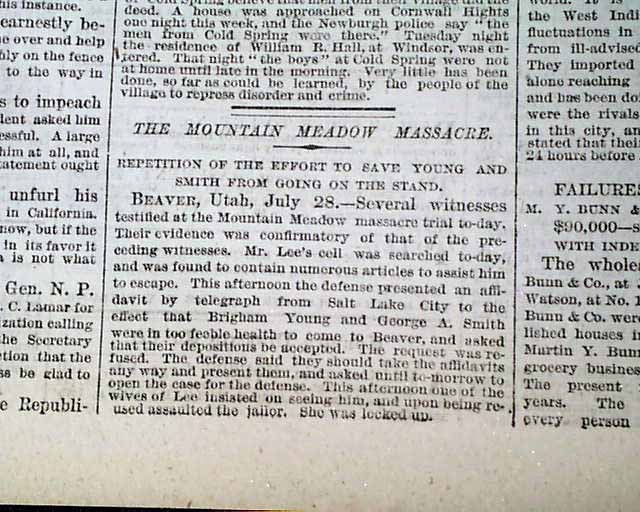 NEW YORK TRIBUNE, July 29, 1875  The bottom of page 5 has a brief article: "The Mountain Meadow Massacre - Repetition of the Effort to Save Young and Smith from Going on the Stand". The report is from