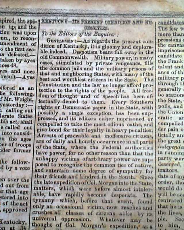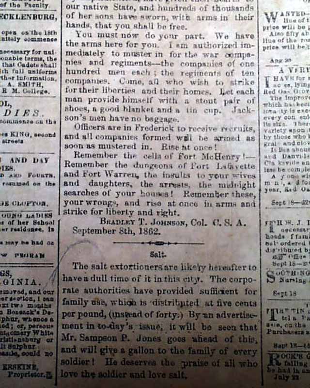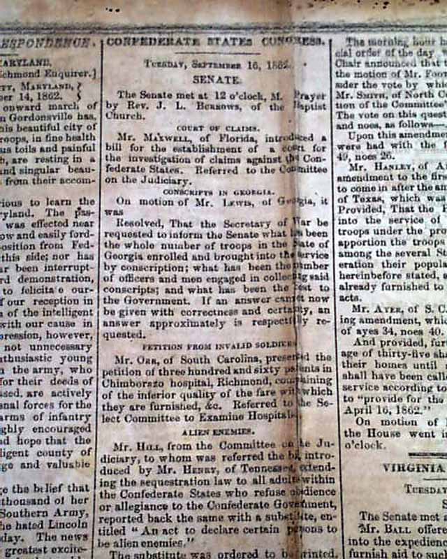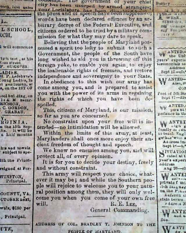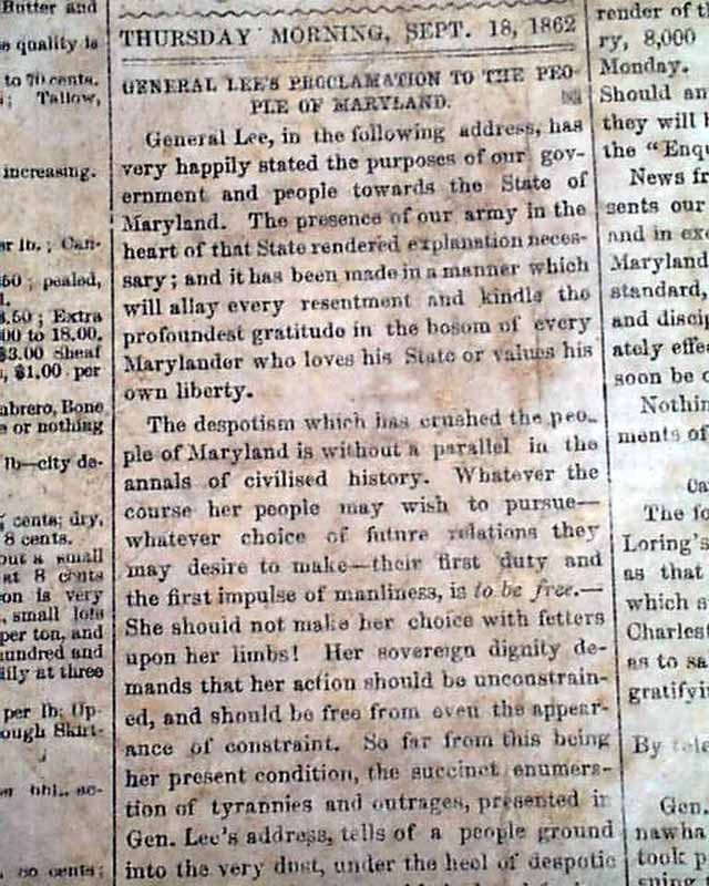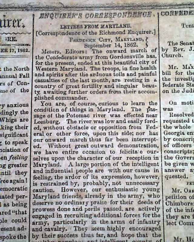 RICHMOND ENQUIRER, Virginia, Sept. 18, 1862 The front page has: "General Lee's Proclamation To the People of Maryland" which presents his reasons for the Confederate army being in that state. Remember that the battle of Antietam was fought just the day before, although not reported in this issue.