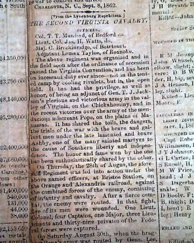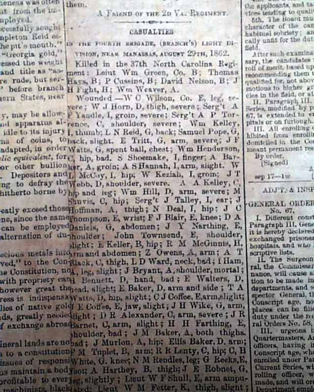 Also on the front page are: "Coinage For the Confederate States" "The Second Virginia Cavalry" with a list of "Casualties" from near Manassas, Aug. 27-29 which is quite lengthy; "City Intelligence" and a bit more including ads & notices.
