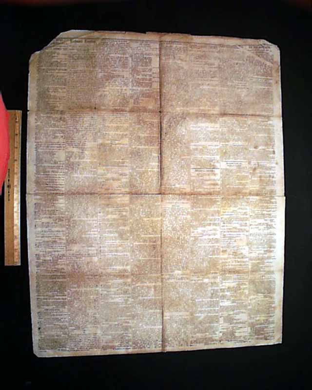 The upper left corner is missing with loss but affecting only ads. Various water staining, foxing and wear at folds.