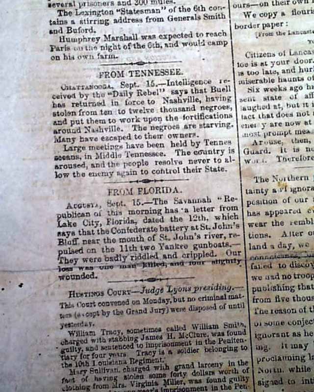 The back page has much on the war, including: "From Tennessee" "From Florida" "Gen. Huger" "Northern Politics" "Letters From Maryland" "Confederate States Congress" "Kentucky--Its Present Condition and Necessities".