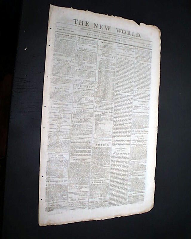 THE NEW WORLD, Philadelphia, Jan. 21, 1797 A quite scarce title, and until a recent find, the very first we have offered in our 44 years. It published for exactly one year. Various news reports and advertisements of the day.