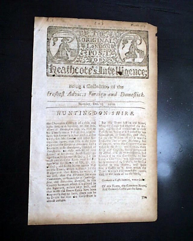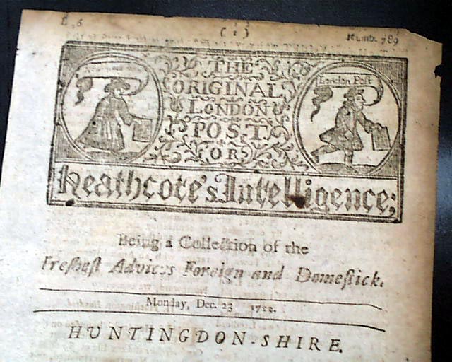 THE ORIGINAL LONDON POST OR, HEATHCOTE'S INTELLIGENCE, London, England, Dec. 23, 1723 A rare title with the text running continuously from issue to issue, the lead sentence being the completion of the last sentence from the previous issue.