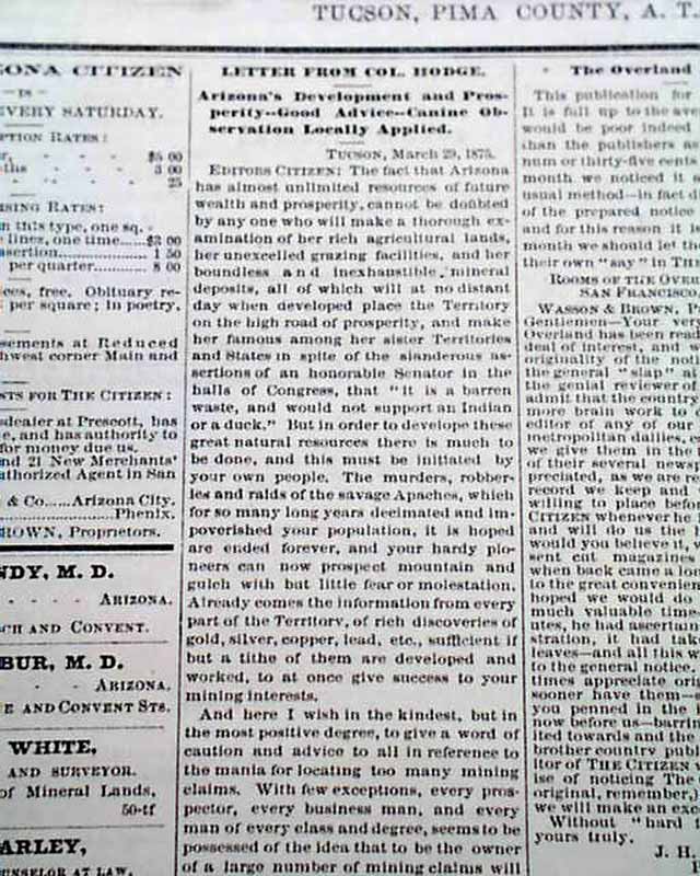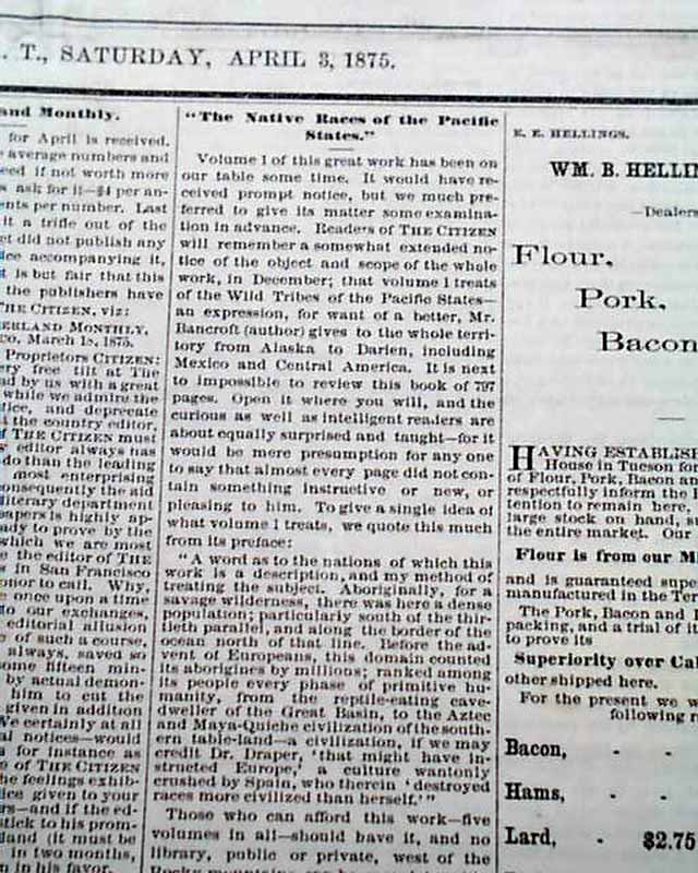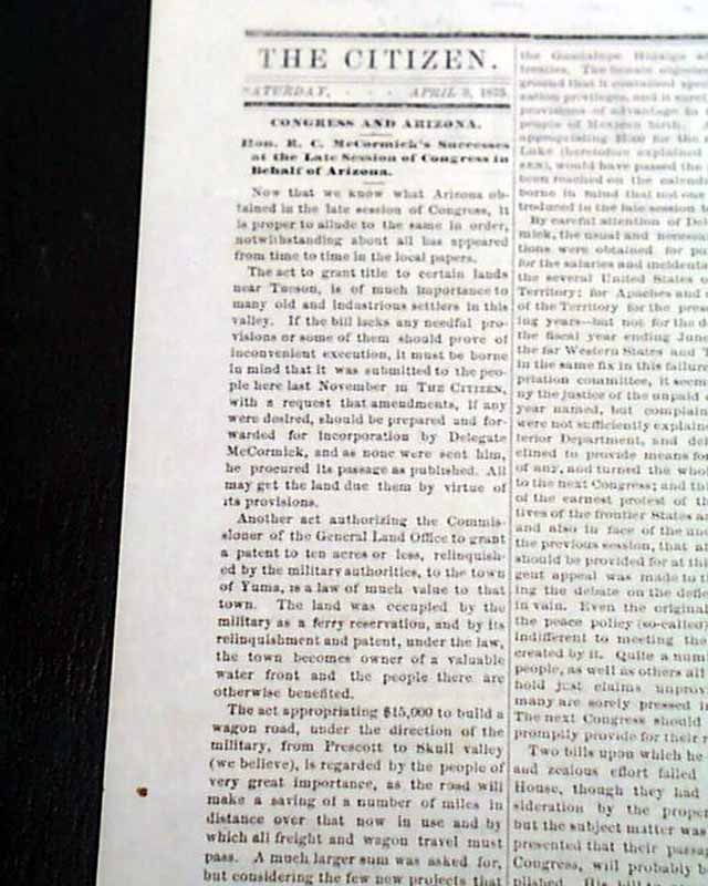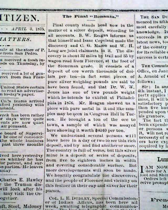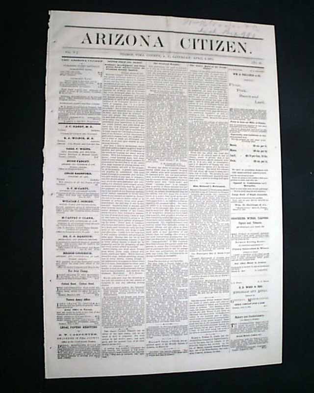 ARIZONA CITIZEN, Tucson, Arizona Territory, April 3, 1875 Many years ago we had a reasonable inventory of this title, but today this issue is among our last.