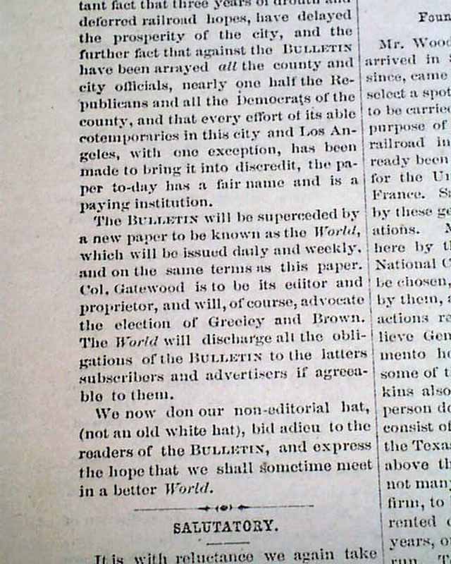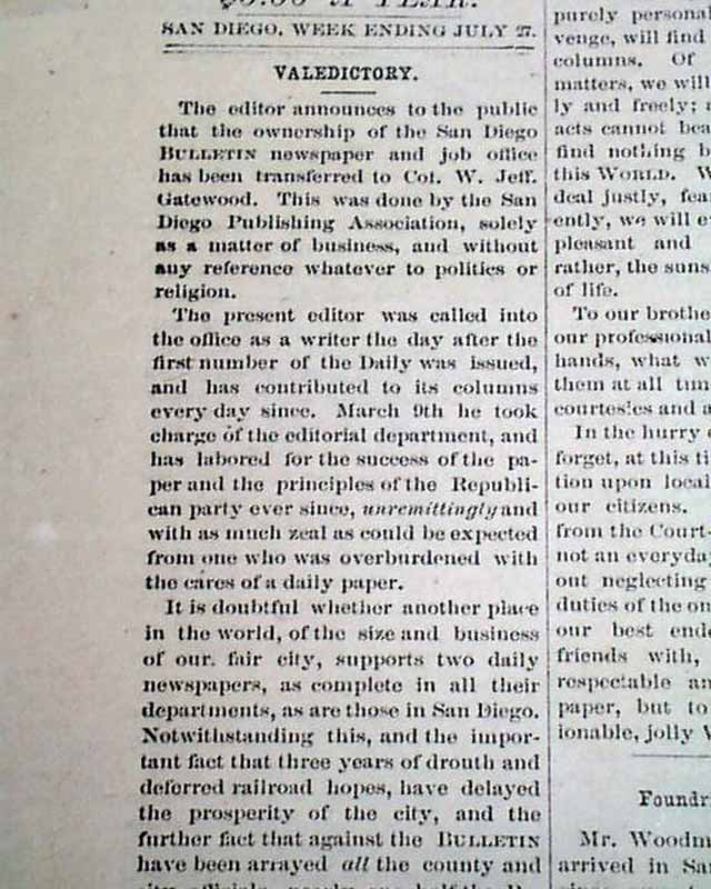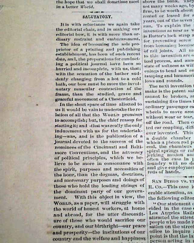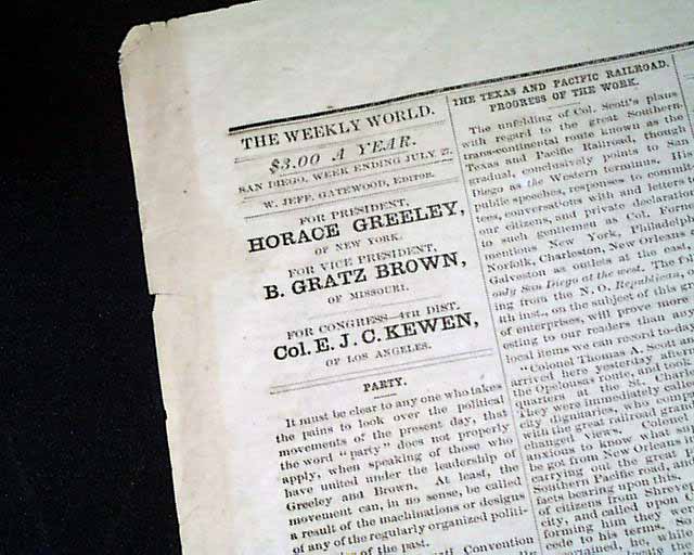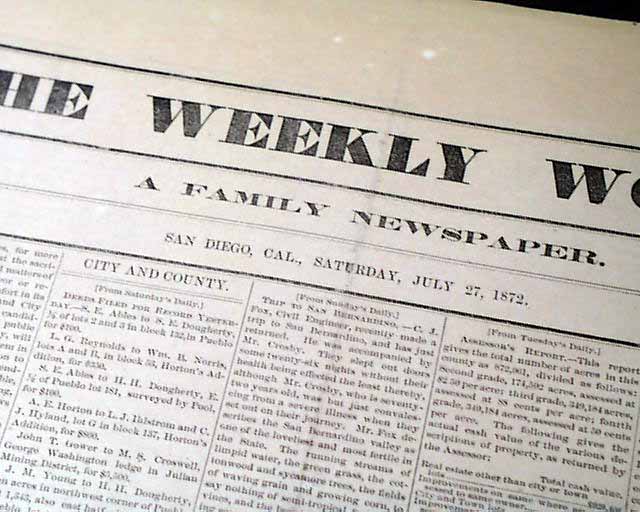 THE WEEKLY WORLD, San Diego, California, July 27, 1872 Perhaps the earliest San Diego newspaper you will find, as this is the volume one, number one issue.