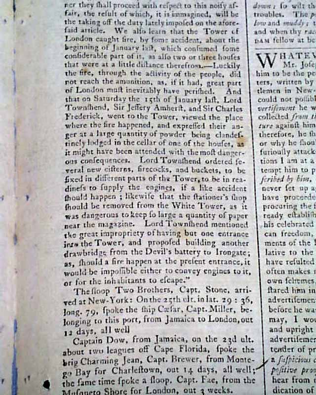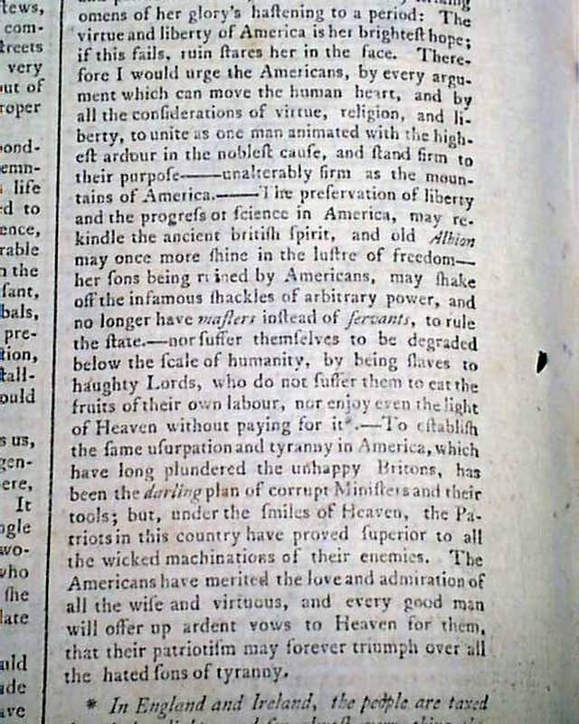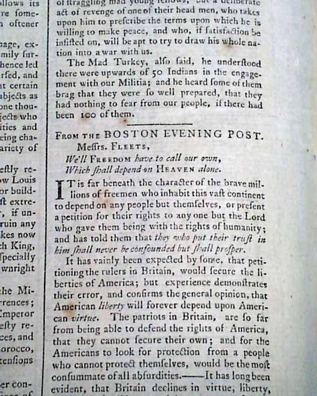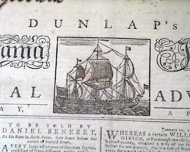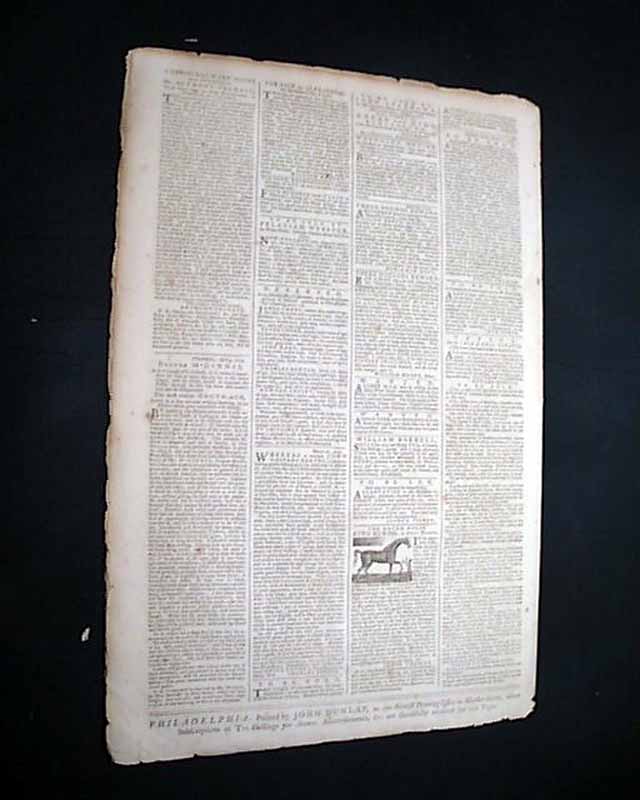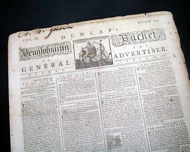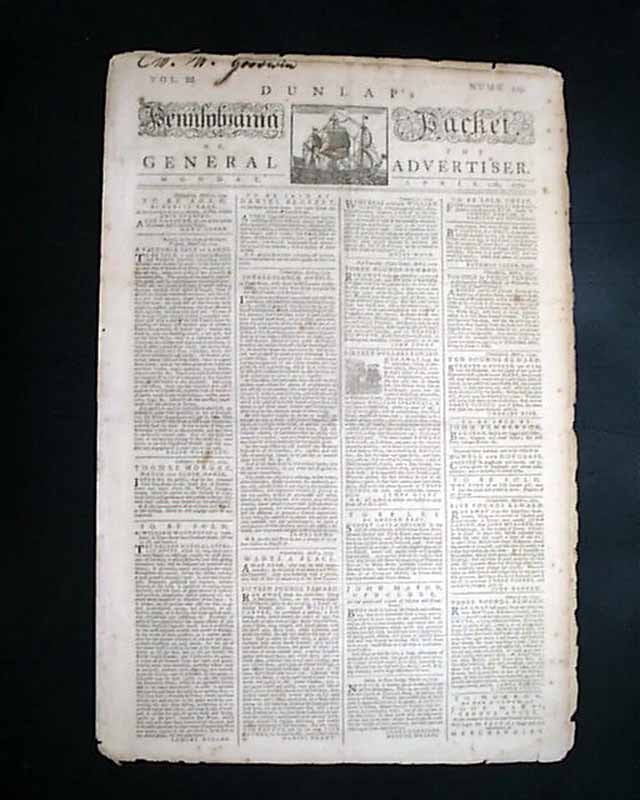 DUNLAP'S PENNSYLVANIA PACKET OR THE GENERAL ADVERTISER, Philadelphia, April 11, 1774  This title had one of the more ornate masthead of the pre-Revolutionary War era. And this issue was printed shortly before the outbreak of war, with content reflecting the brewing troubles between England and the American colonies.