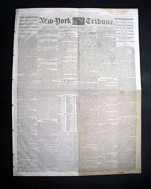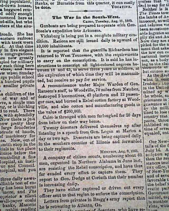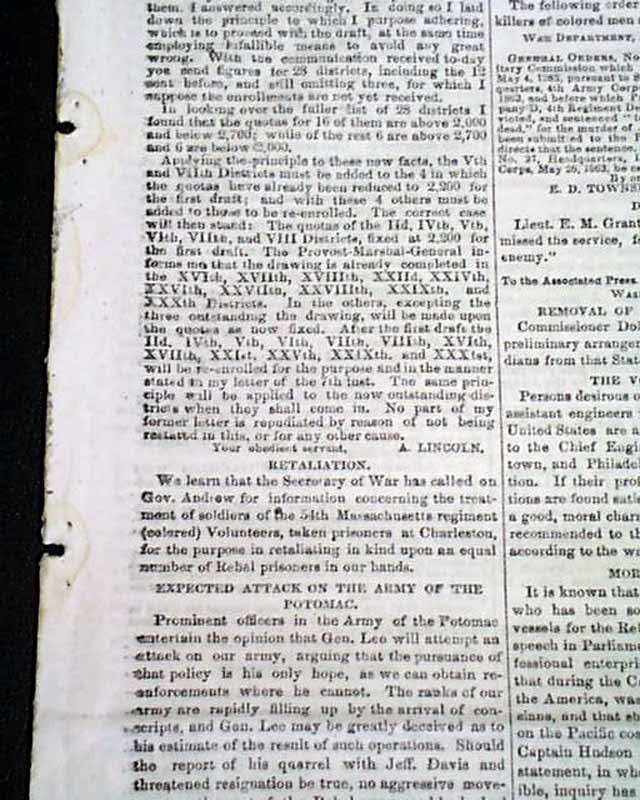 NEW YORK TRIBUNE, Aug. 12, 1863 The top of the first column has: "President Lincoln On The Draft" "Retaliation for Abuse of Colored Troops" which has his letter signed in type: A. Lincoln. Also: "Lee Expected To Attack Meade" "End of the Naval Campaign in the Mississippi" and more.
