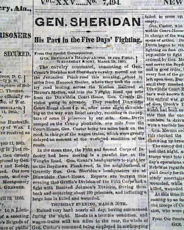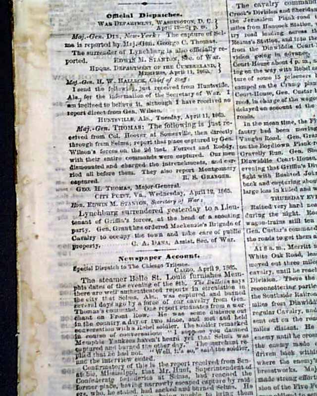 The front page column heads include: "MORE GOOD NEWS" "Capture Of Lynchburg" "Gen. Lee En Route to Richmond" "Selma and Montgomery, Ala., Also Taken" "Forrest & Roddy Prisoners" "GEN. SHERIDAN and more.