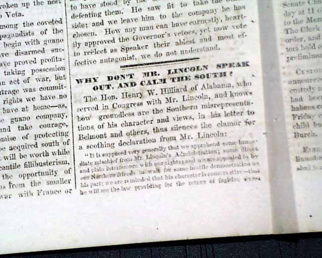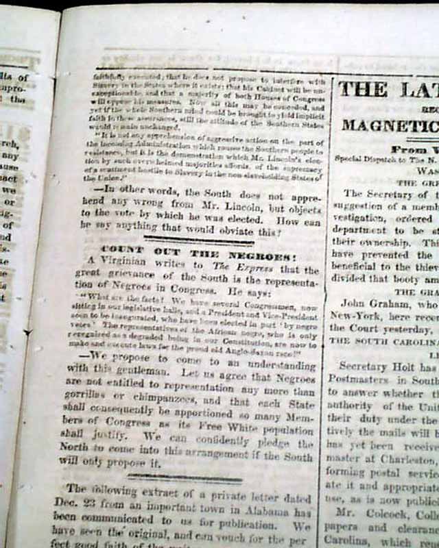 Pages 4 & 5 contain an article: "Why Don't Mr. Lincoln Speak Out, and Calm the South?" which includes in part: "...we are reminded that his character is conservative--that he will see the law providing for the return of fugitive slaves...that he does not propose to interfere with Slavery in the states where it exists..." with a bit more.  This is followed by an article: "Count Out The Negroes".