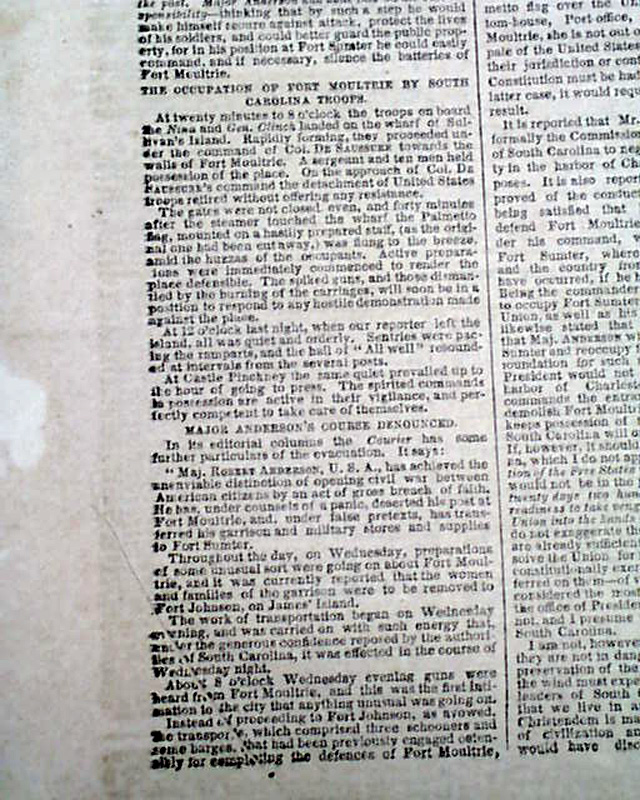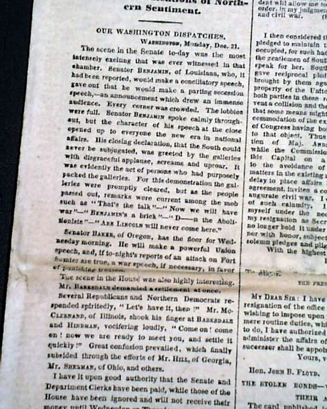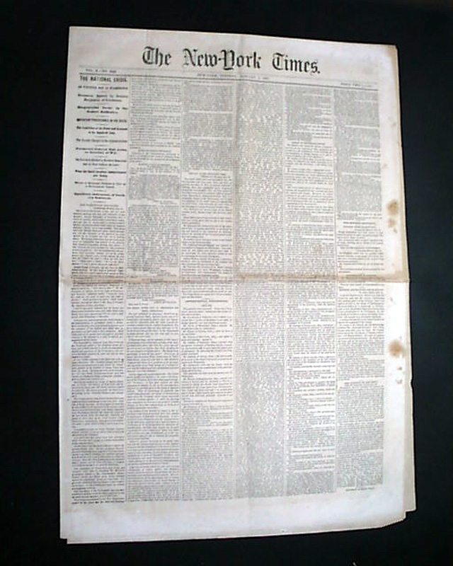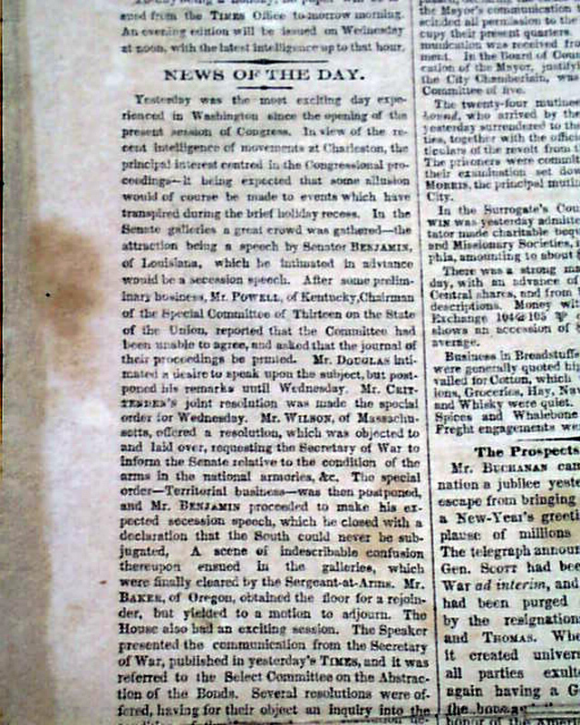 NEW YORK TIMES, Jan. 1, 1861  Among the front page first column heads: "THE NATIONAL CRISIS" "Secession Speech by Senator Benjamin of Louisiana" "Disgraceful Scene in the Senate Galleries" "The Condition of the Forts & Arsenals to be Inquired Into" "What the South Carolina Commissioners are Doing" "Significant Indications of Northern Sentiment".