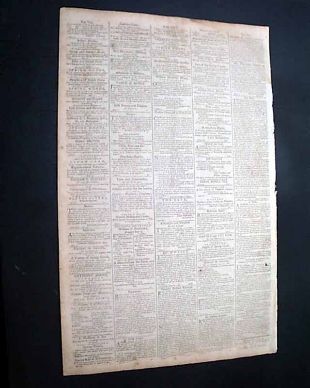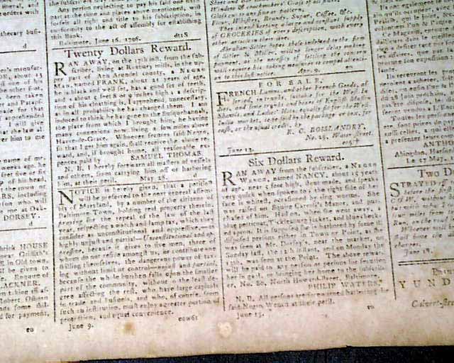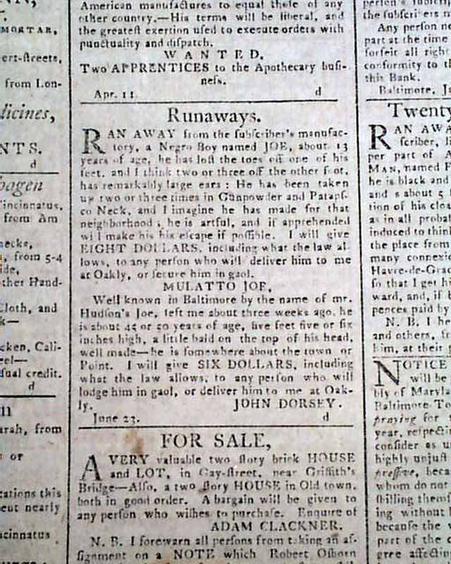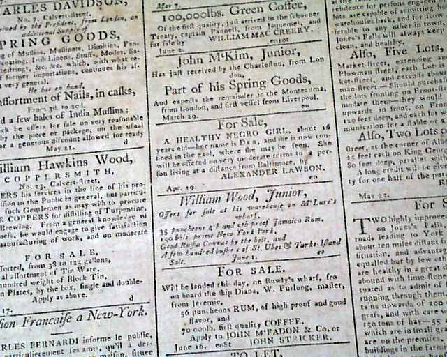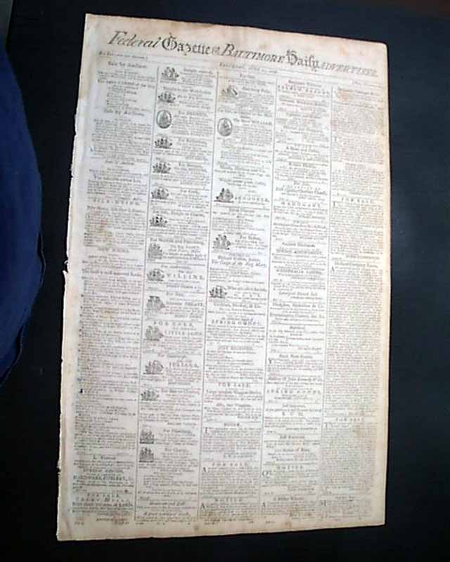 FEDERAL GAZETTE & BALTIMORE DAILY ADVERTISER, July 5, 1796  Curiously, five different type fonts are used to print the title in the masthead. The front page features 20 illustrated ship ads, making it very displayable.