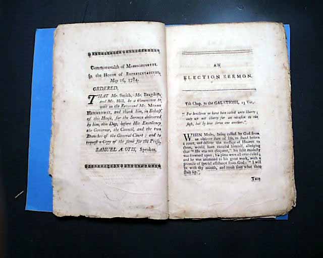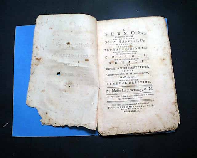 Pamphlet titled: "A SERMON, preached before His Excellency JOHN HANCOCK, Esq; governor; His Honor THOMAS CUSHING, Esq; lieutenant-governor; the Honorable the Council, and the Honorable the SENATE, and House of Representatives, of the Commonwealth of Massachusetts, May 26, 1784. Being the day of general election. By Moses Hemmenway, A.M., Boston, Printed by Benjamin Edes and Sons, M,DCC,LXXXXIV".