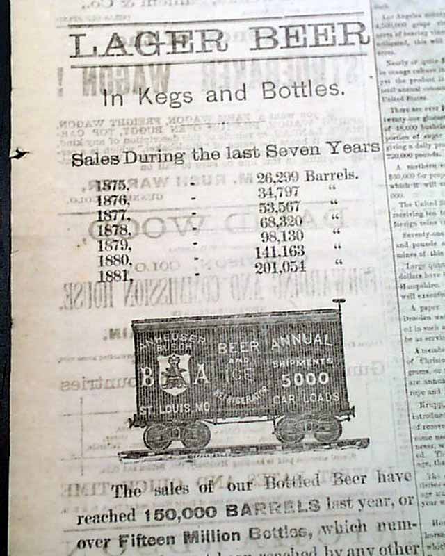 AI notes: In 1882, the Anheuser-Busch Brewing Association of St. Louis, Missouri, was gaining national prominence through striking newspaper advertisements that promoted its flagship product, Budweiser Lager Beer. These ads emphasized the brewery’s modern facilities and scientific brewing methods, boasting that Budweiser was made “after the best Bohemian process” using Saazer hops and choice barley-malt to ensure purity and superior flavor. Each notice proudly displayed the firm’s eagle-and-“A” trademark, a symbol of quality and American enterprise, alongside the slogan proclaiming Budweiser as “The King of Bottled Beers.” The company highlighted its pioneering use of pasteurization and refrigerated railcars, innovations that allowed its beer to be shipped across the country without spoilage—an extraordinary feat for the time. By 1882, the St. Louis-based brewery, operating under its formal corporate name, had transformed from a regional operation into a modern, industrial powerhouse, marketing its beer as a national symbol of craftsmanship and consistency.