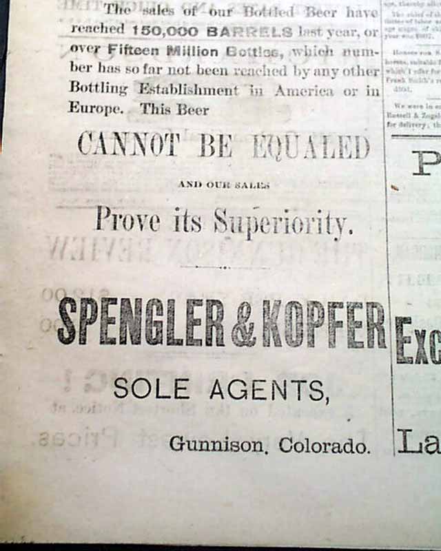 This is a typically Western newspapers with local news, including mining-related reports, and a wealth of Western-style advertisements, including a large front page ad for Anheuser-Busch Brewing Company.