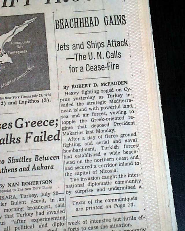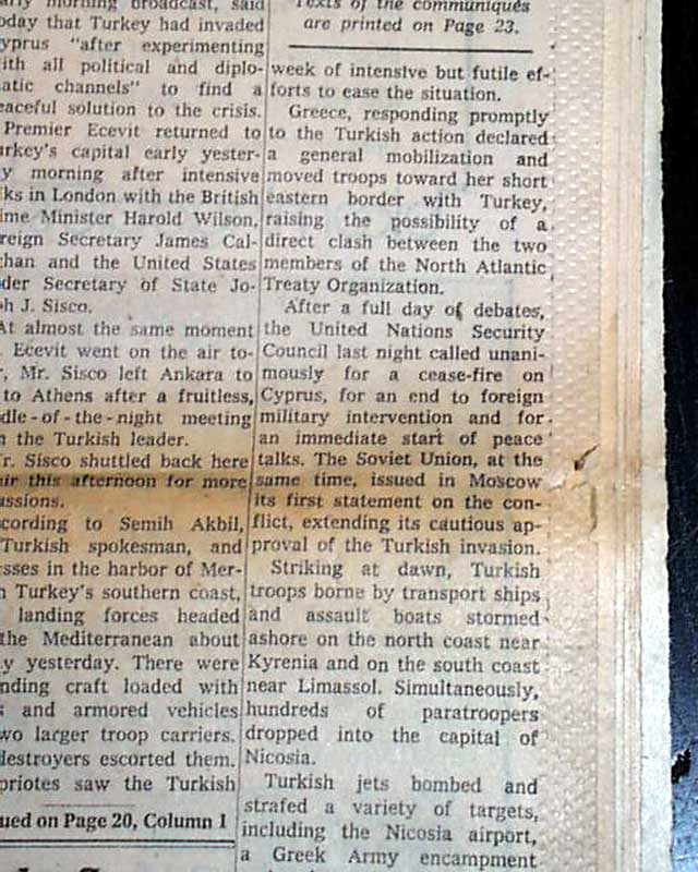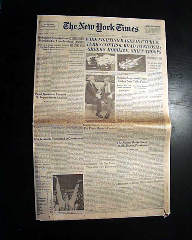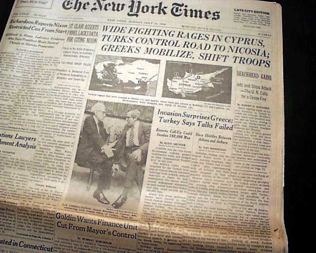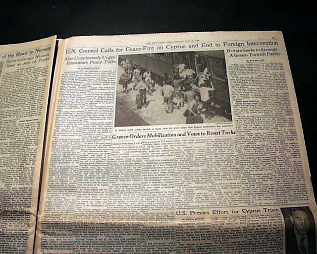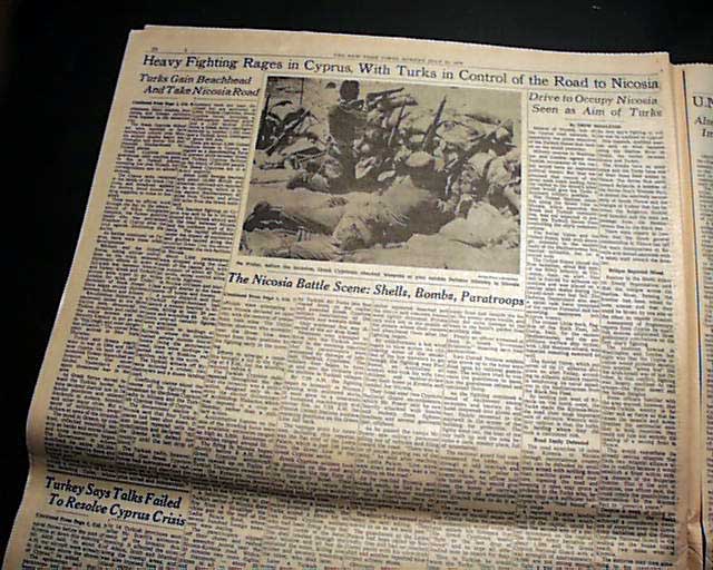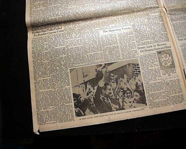 The top of the frolnt page has a five column headline: "WIDE FIGHTING RAGES IN CYPRUS, TURKS CONTROL ROAD TO NICOSIA; GREEKS MOBILIZE, SHIFT TROOPS" with subheads, two related maps & photo. Much more inside.