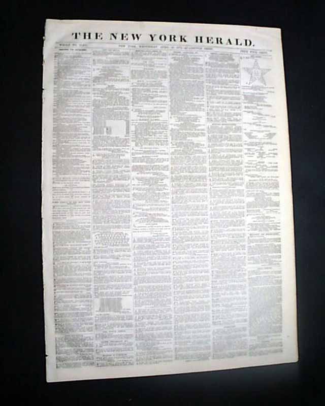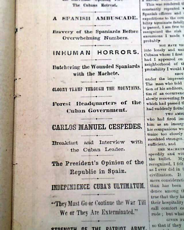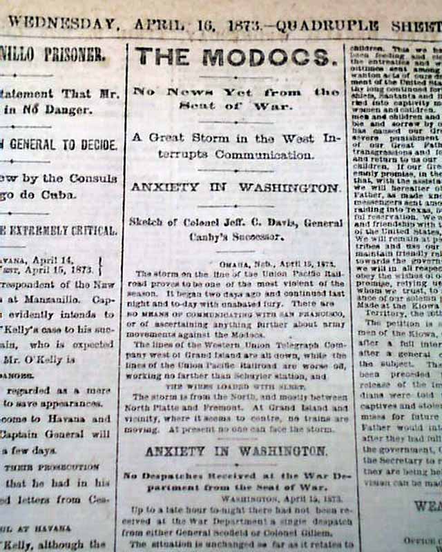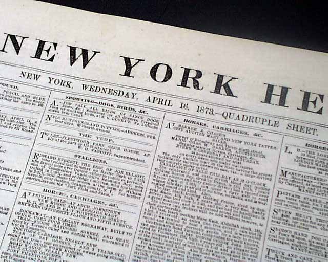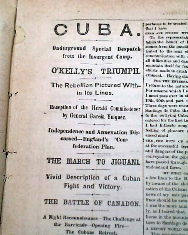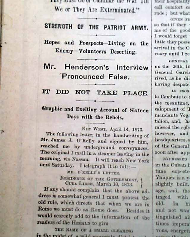 NEW YORK HERALD, April 16, 1873  Inside has a wealth of reporting on the events in Cuba at the time with nearly a full column of heads including: "CUBA" "O'Kelly's Triumph" "The March to Jiguani" "The Battle of Canadian" "A Spanish Ambuscade" "Inhuman Horrors" "Strength of the Patriot Army" and much more.