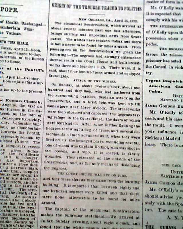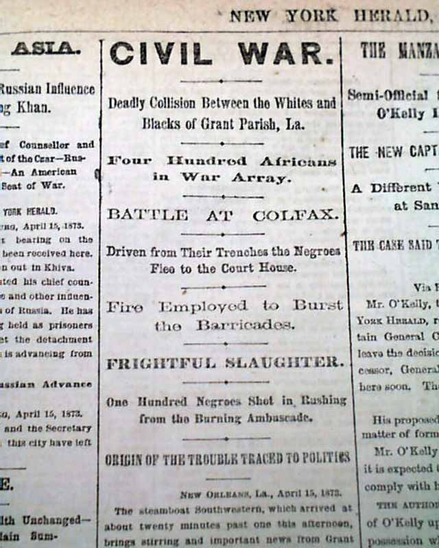 Other columns heads include: "Deadly Collision Between the Whites and Blacks of Grant Parish, La." "Battle at Colfax" "Frightful Slaughter" "THE MODOCS" "Anxiety In Washington" & much more.