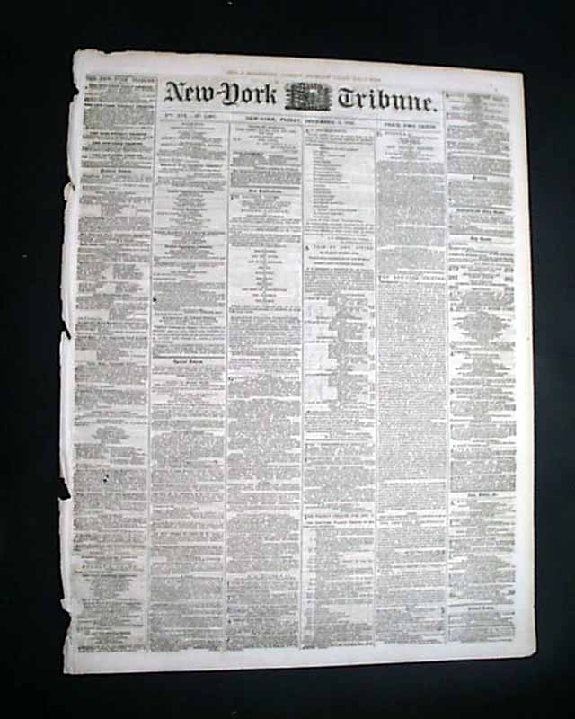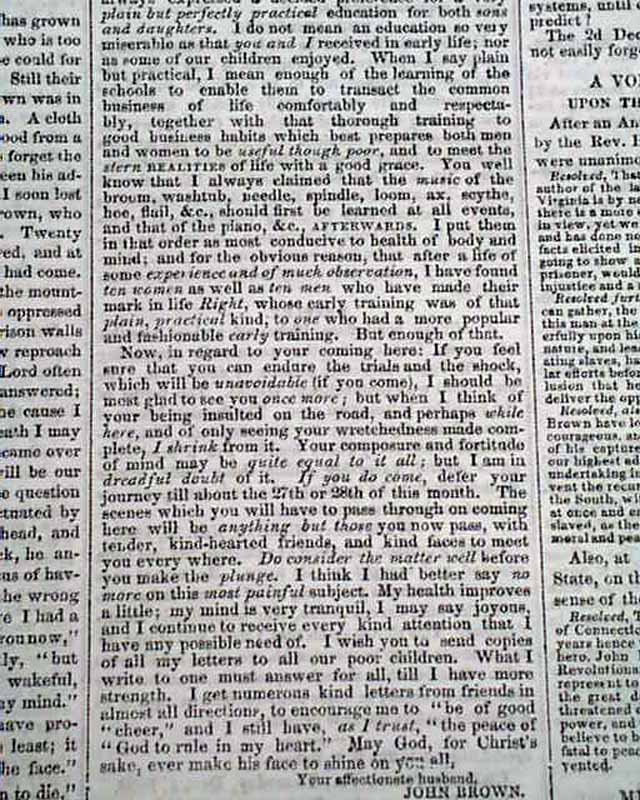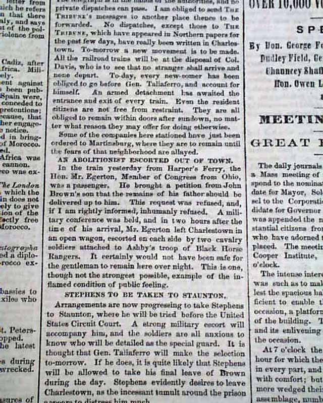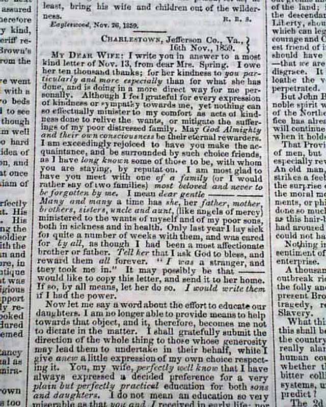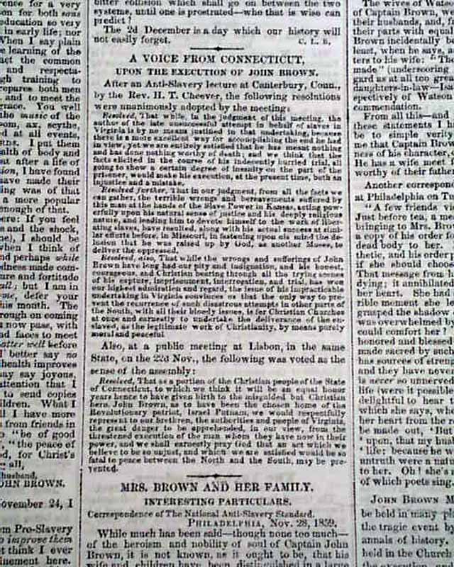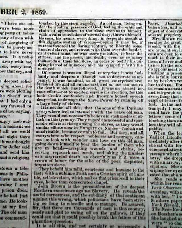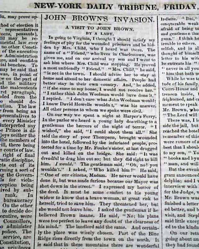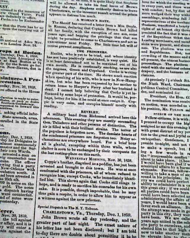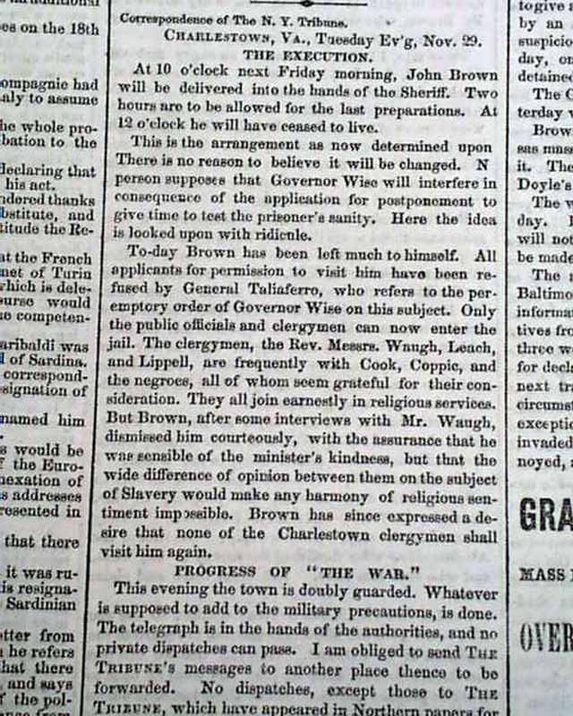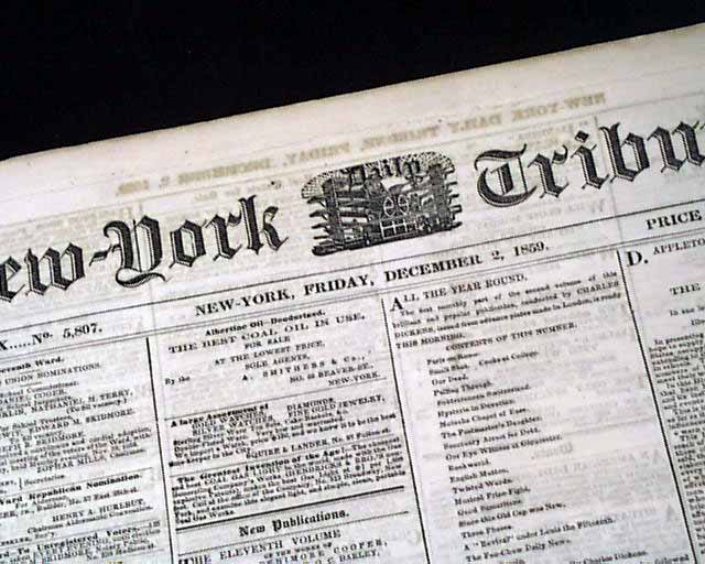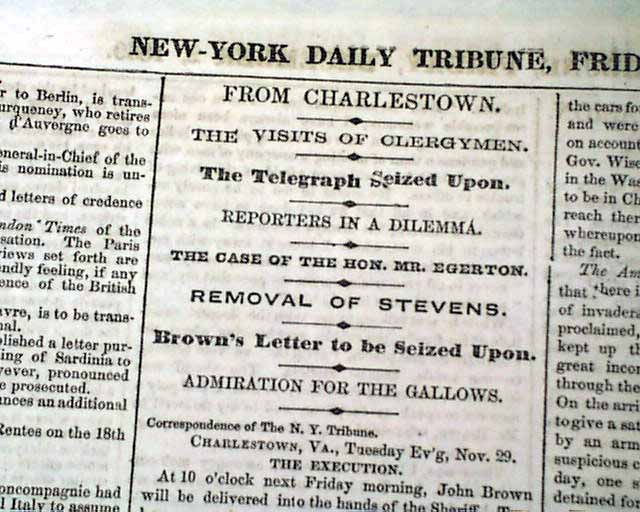 NEW YORK TRIBUNE, Dec. 2, 1859 Page 5 & 6 have considerable reporting on plans for the hanging of John Brown for his involvement in the Harper's Ferry insurrection. Column heads include: "John Brown's Invasion - A Visit To John Brown"; a letter from Charlestown signed in type: John Brown; "The Day of Execution" "Mrs. Brown & Her Family" "From Charlestown" "Brown's Letter to Be Seized Upon" "Admiration For the Gallows" and more.