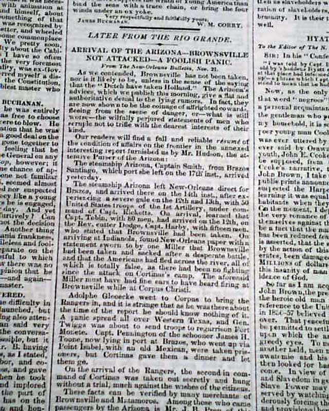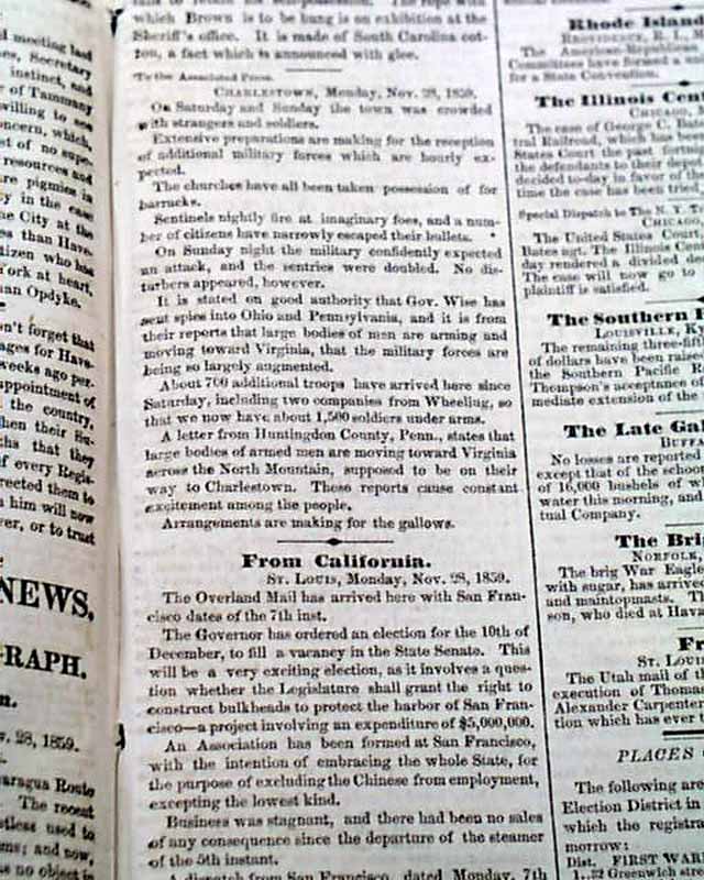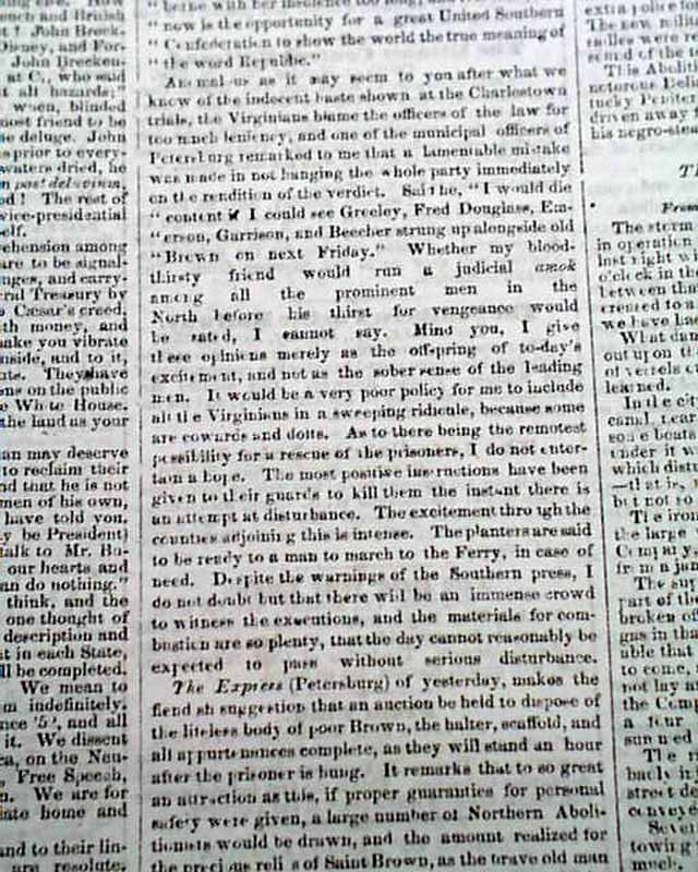 background: This issue of the New York Tribune serves as a grim snapshot of a fractured republic, capturing the precise moment the American legal and social order began to collapse under the weight of the slavery question. By November 29, 1859, the federal government was fighting a two-front war for stability: in the Southwest, the Cortina War in Brownsville signaled a breakdown of authority on the Mexican border, while in the East, the impending execution of John Brown turned Charlestown, Virginia, into an armed camp. The headlines regarding "Churches Used for Barracks" and "Spies Sent Out" reveal a Southern establishment gripped by an almost hysterical paranoia, fearing that Brown’s raid was not an isolated incident but the vanguard of a massive Northern invasion. Meanwhile, the Tribune’s inclusion of "The Slave Exodus" and Brown’s "Letter to the Public" highlights the shift in Northern sentiment; as Brown traded his Sharps rifle for a pen in his final days, he successfully transitioned from a failed insurgent to a powerful abolitionist martyr, effectively polarizing the nation beyond the point of political reconciliation just one year before the election of Abraham Lincoln.
