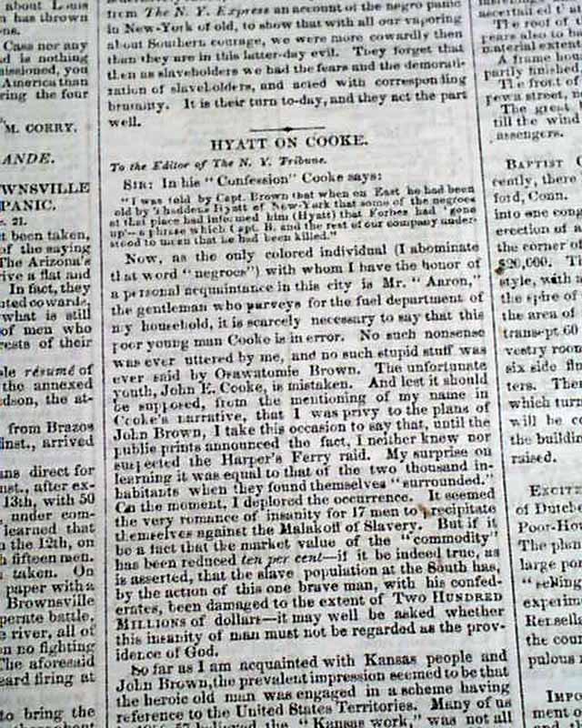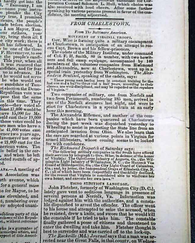 But the more notable content is on the John Brown raid at Harper's Ferry, with column heads including: "Further from Charlestown" "Additional Troops Expected" "The Churches Used for Barracks" "Soldiers Firing in the Air" "Narrow Escape of Citizens" "Spies Sent Out by Gov. Wise" "John Brown Preparing a Letter to the Public" "John Brown's Invasion" and: "John Brown, Jr." A small article: "The Slave Exodus"