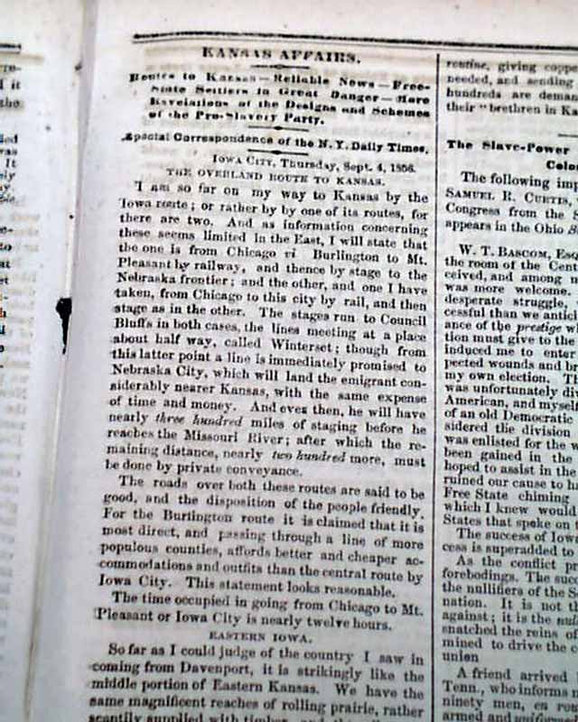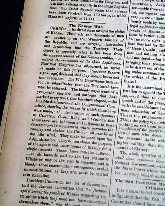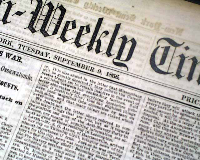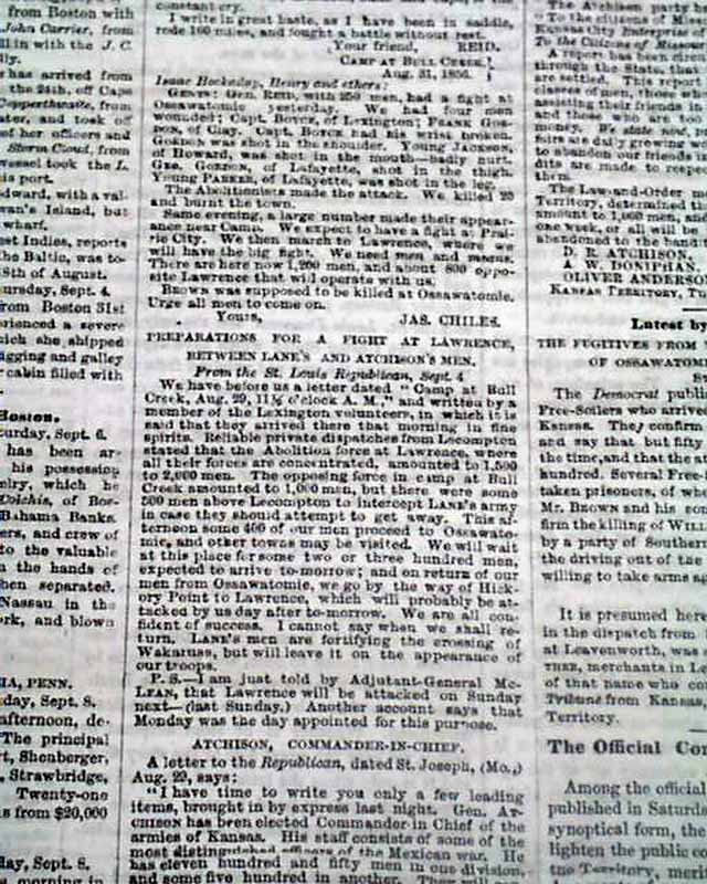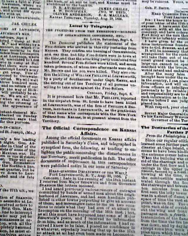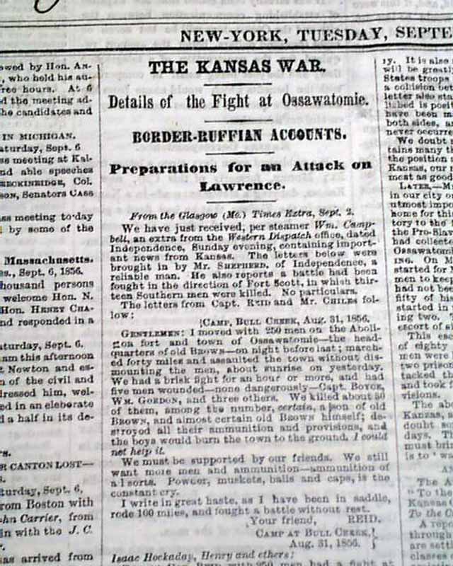 The front page has much reporting on "Bleeding Kansas" with column heads: "THE KANSAS WAR" "Details of the Flight at Ossawatomie" "Border-Ruffian Accounts" "Preparations for an Attack on Lawrence" "Official Correspondence on Kansas Affairs" and more.