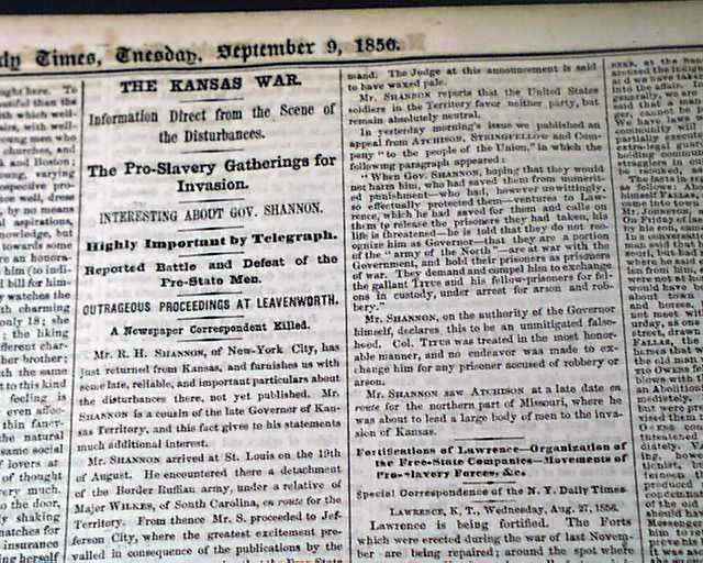 Even more reporting on page 3 with: "The Kansas War" "Information Direct from the Scene of the Disturbances" "The Pro-Slavery Gatherings for Invasion" "Reported Battle & Defeat of the Pro-State Men" and more, these reports taking nearly half of the page.