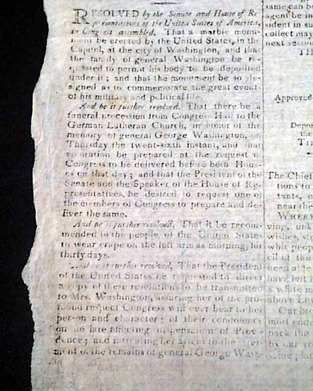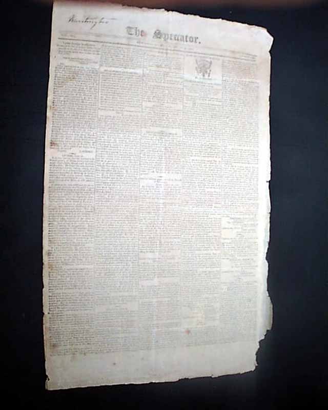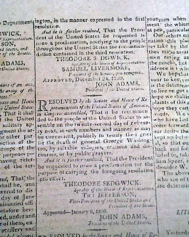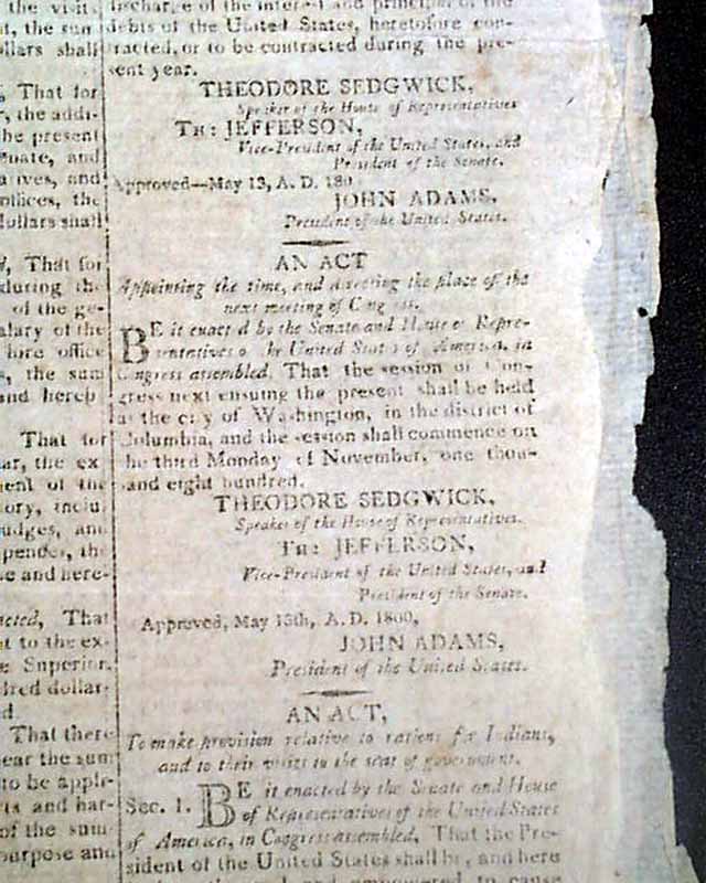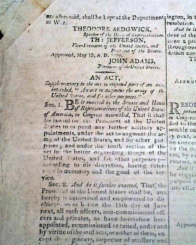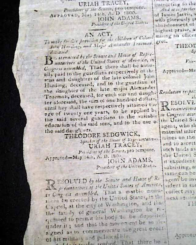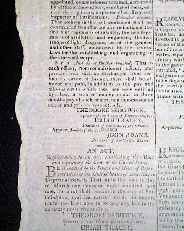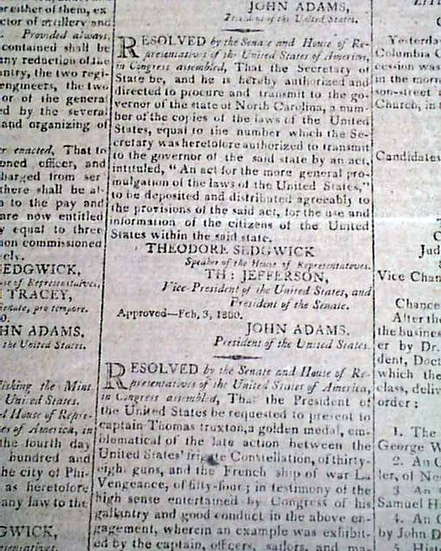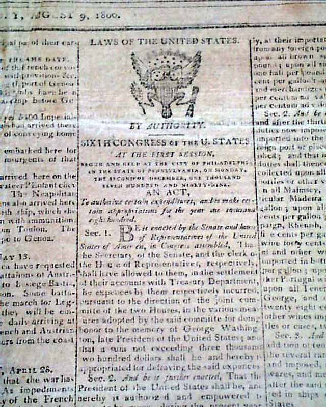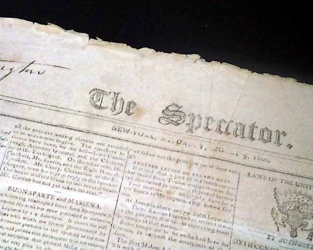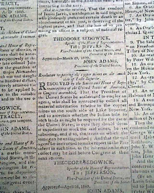 THE SPECTATOR, New York, Aug. 9, 1800 Headed by an engraving of a heraldic eagle, the front page has four Acts of Congress, carrying over to page 2 where there are an additional three Acts and five "Resolves", each signed in type by the President, John Adams, with the Resolves also signed by Thomas Jefferson as well.