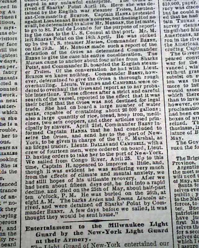 NEW YORK TIMES, June19, 1859  The front page has two-thirds of a column headed: "The Suspected Slaver - Description of the Belssel--Manifest of her Cargo...". The text notes in part: "The bark Orion...which arrived in this port...from the coast of Africa...been seized...upon suspicion of intention to engage in the slave trade..." with much more.