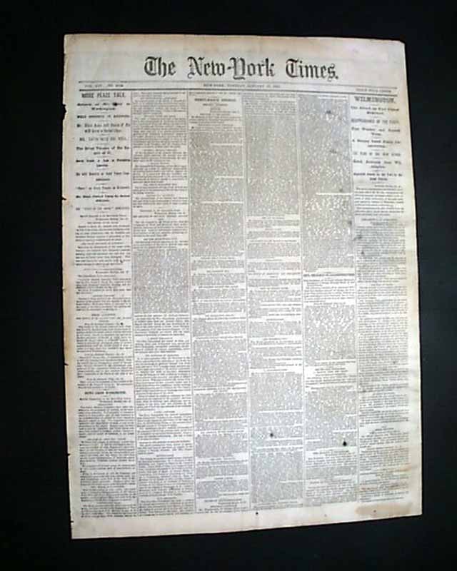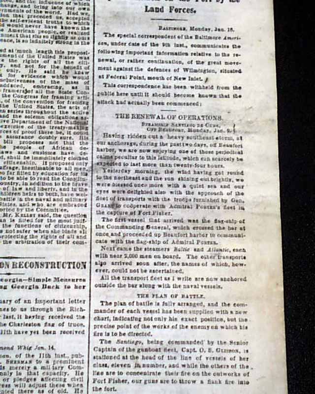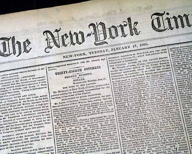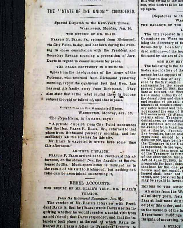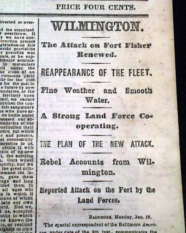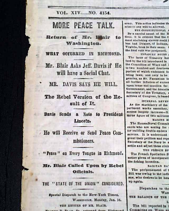 NEW YORK TIMES, Jan. 17, 1865 Among the front page column heads on the Civil War are: "WILMINGTON" "The Attack on Fort Fisher Renewed" "The Plan of the New Attack" "Rebel Accounts from Wilmington" "MORE PEACE TALK" "Mr. Blair Asks Jeff. Davis if He will have a Social Chat" "Mr. Davis Says He Will" "Davis Sends a Note to President Lincoln" and more.