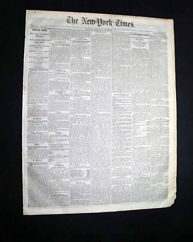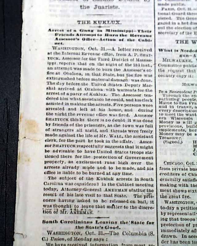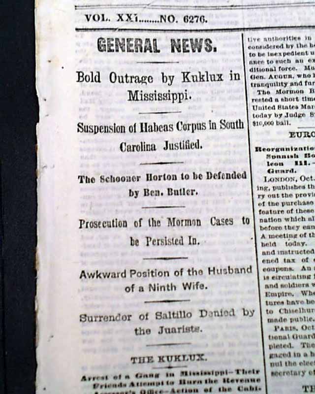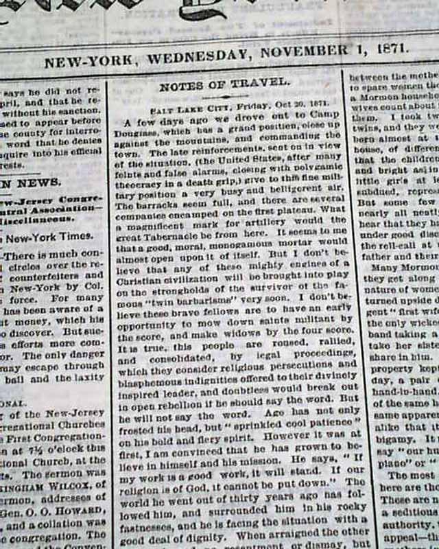 NEW YORK TIMES, Nov. 1, 1871 Among the front page column heads: "Bold Outrage by Kuklux in Mississippi" "Suspension of Habeas Corpus in South Carolina Justified" "Prosecution of the Mormon Cases to be Persisted In" "Awkward Position of the Husband of a Ninth Wife".