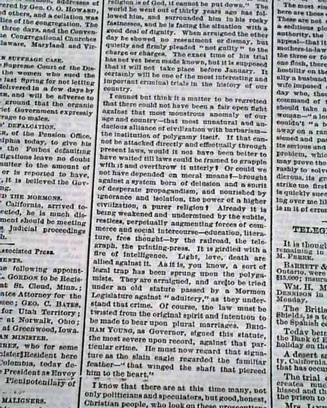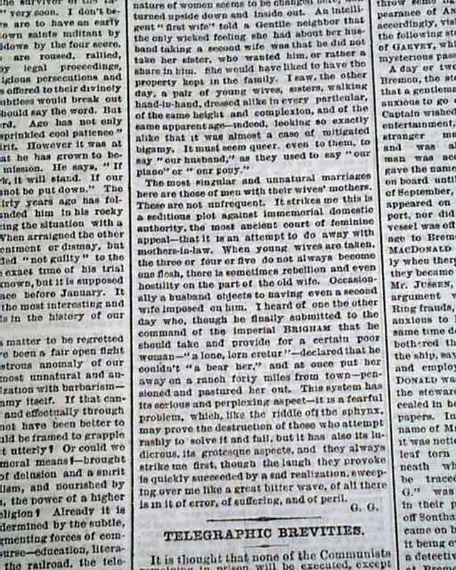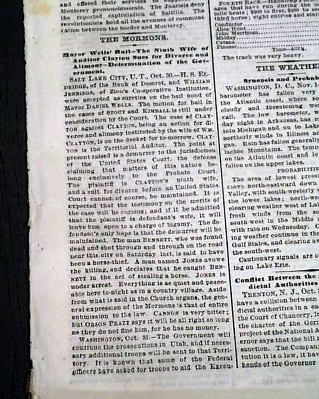 Among the subheads: "The Mormons" "Mayor Wells' Bail--The Ninth Wife of Auditor Clayton Sues for Divorce and Alimony--Determination of the Government".