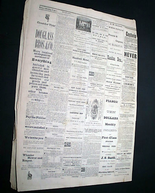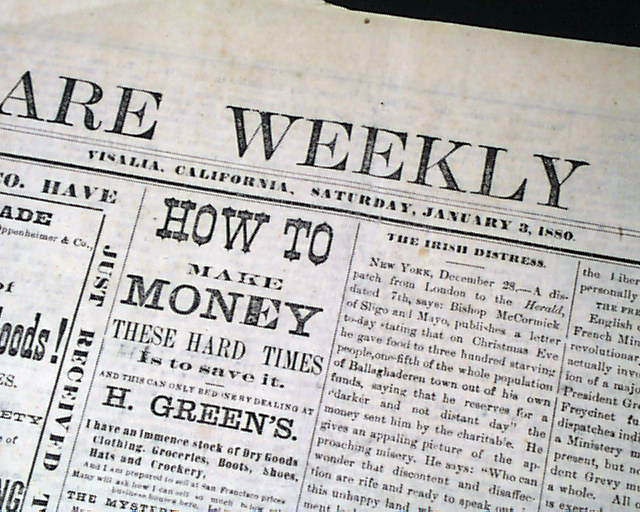 TULARE WEEKLY TIMES, Visalia, California, Jan. 3, 1880 From this Tulare County city in the agriculturally-rich San Joaquin Valley of Central California. News of the day with several interesting advertisements.