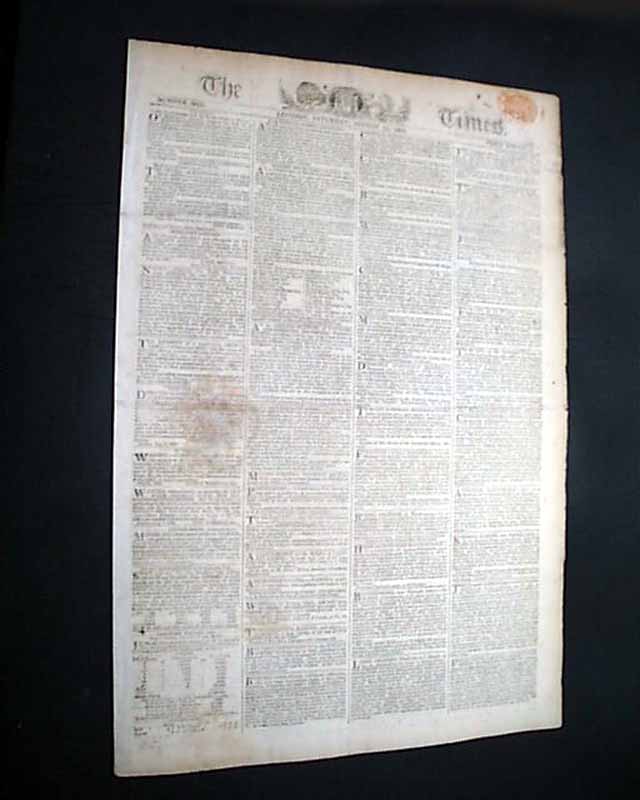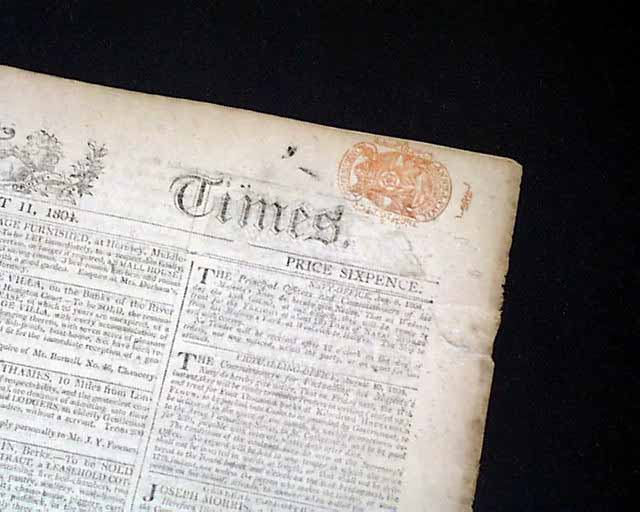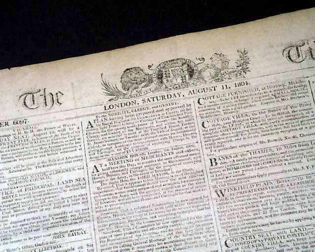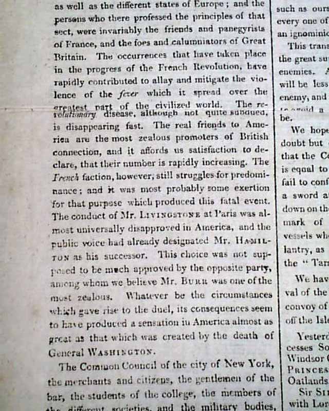 THE TIMES, London, England, Aug. 11, 1804  Page 2 begins with a nice report concerning the death of Alexander Hamilton, noting in part: "...intelligence which may be considered of most important in them respects the death of General Hamilton...He died on the 12 of July...in consequence of a wound received in a duel on the morning of the preceding day. His antagonist was Colonel Burr, who fills the office of Vice President of the United States. The causes which led to this unhappy catastrophe...are supposed to have arisn out of those political animosities which have prevailed in America...since the glorious epoch of the French Revolution..." and much more.