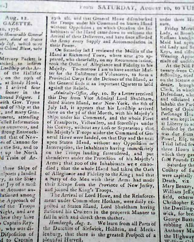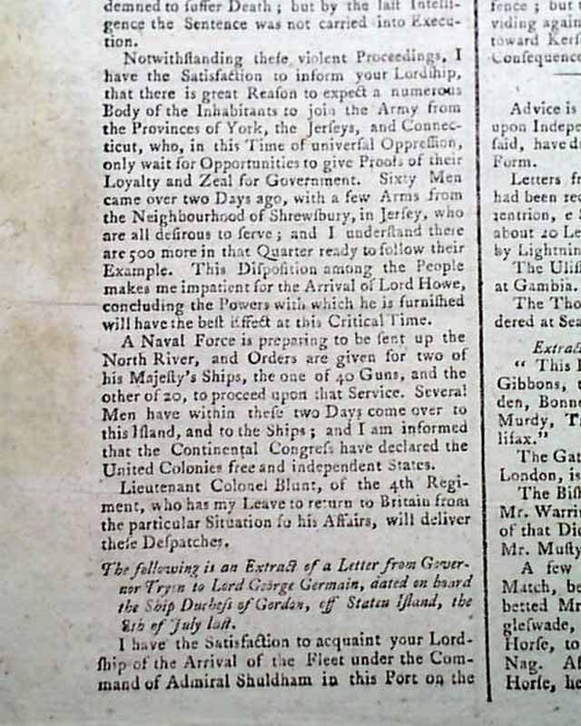 This is the earliest date we have seen of the announcement of the Declaration of Independence is any British newspaper (note: London Chronicle had the same notice in their August 13 issue, but on page 3).